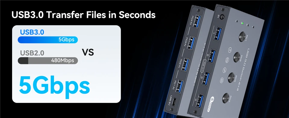 【High Speed Data Transfer】The 4 Port USB switcher is equipped with 4 USB 3.0 ports and it supports data transfer up to 5Gbps and is backward compatible with USB 2.0 and USB 1.1 devices.USB switch 4 in 4 out supports plug and play,very convenient and fast, just plug in the power supply, you can quickly read the data and achieve high-speed data transmission.