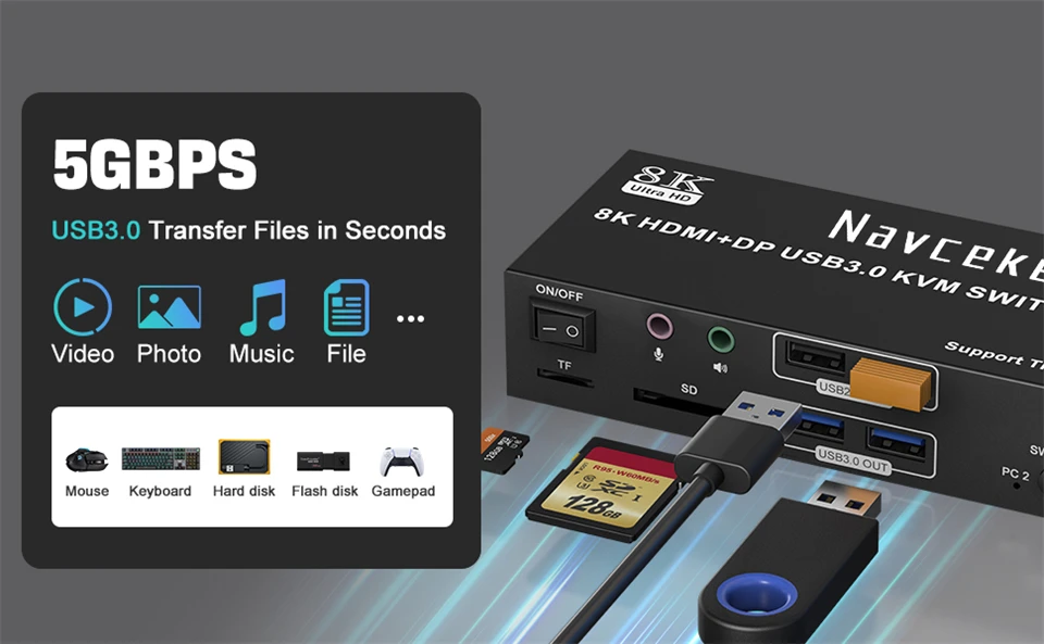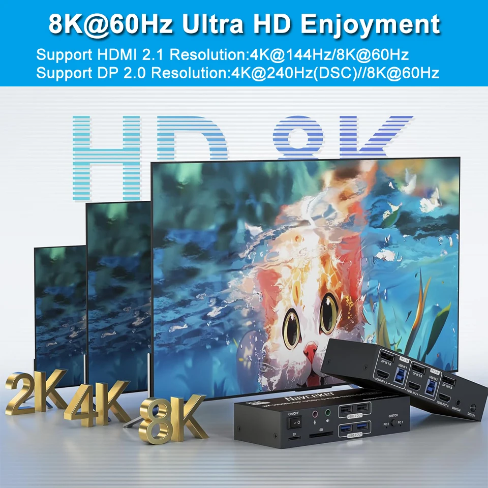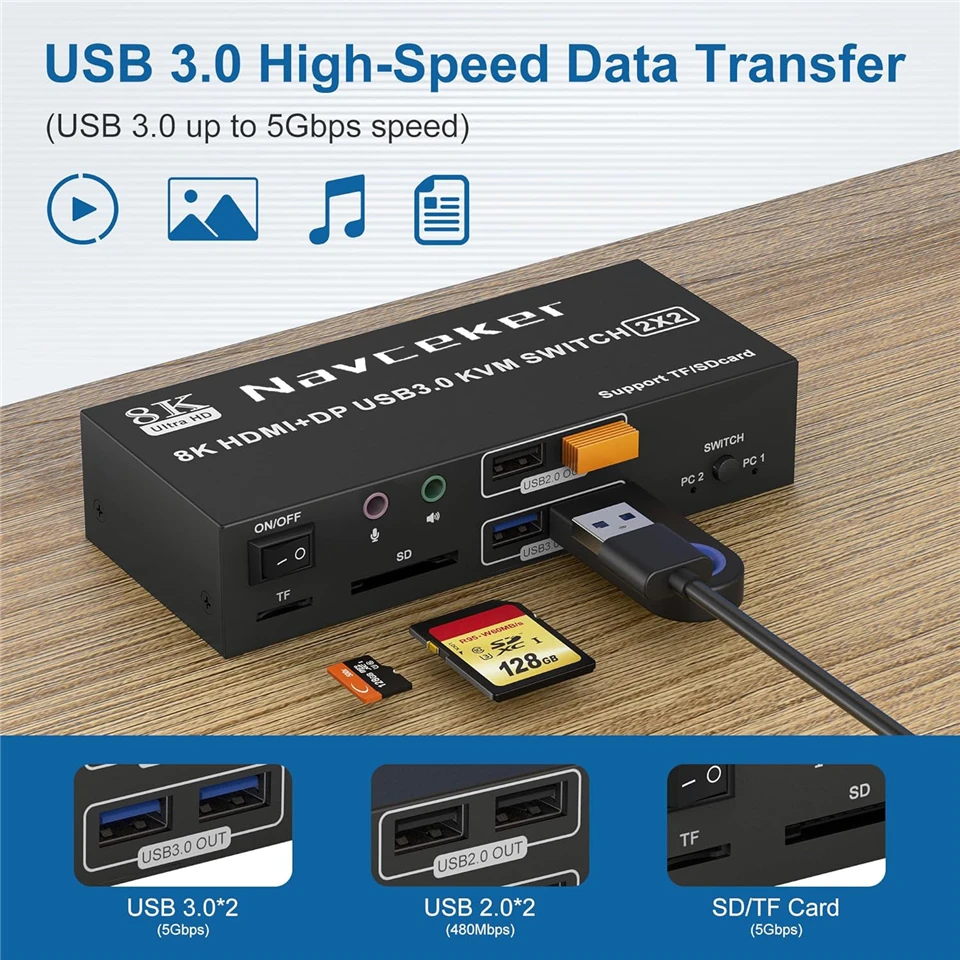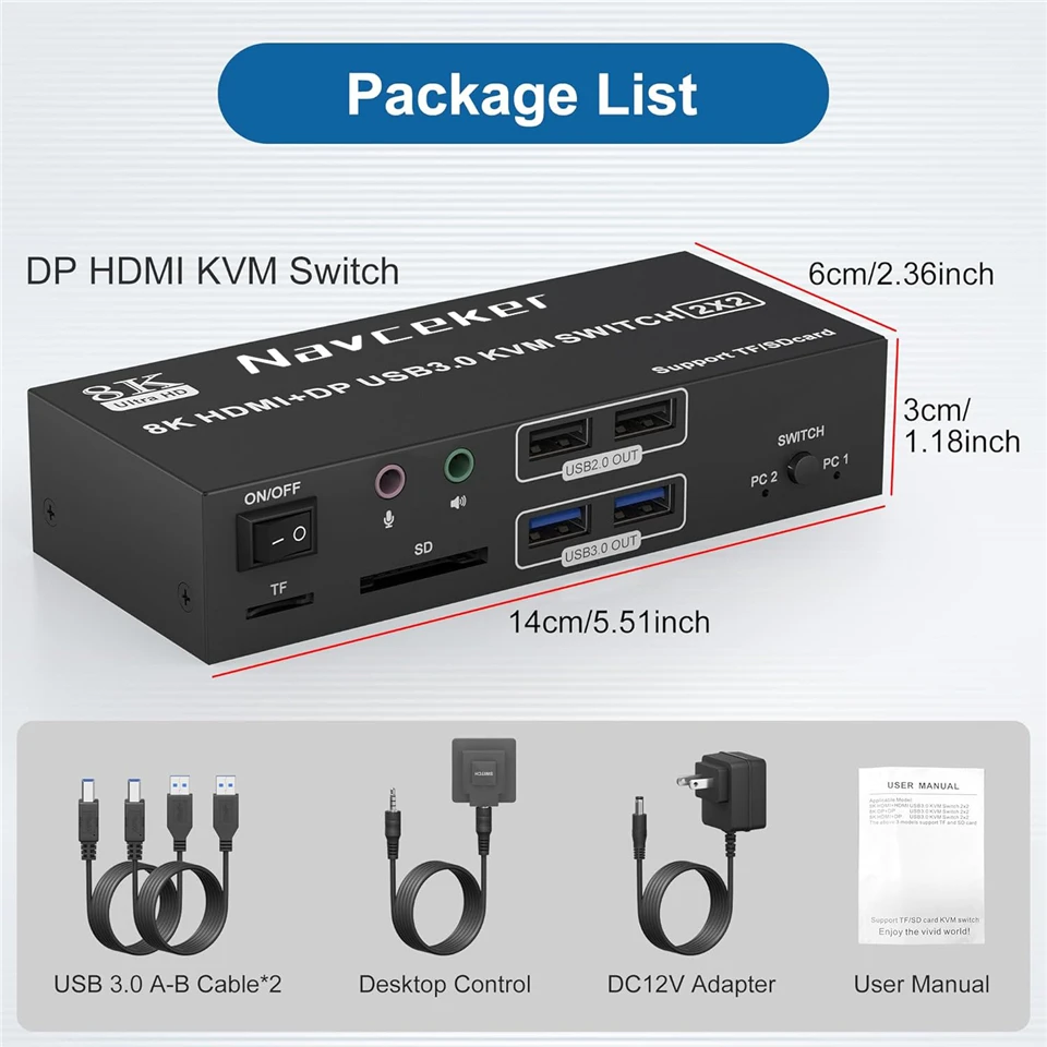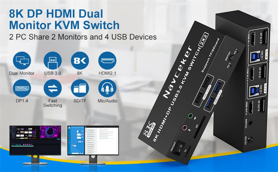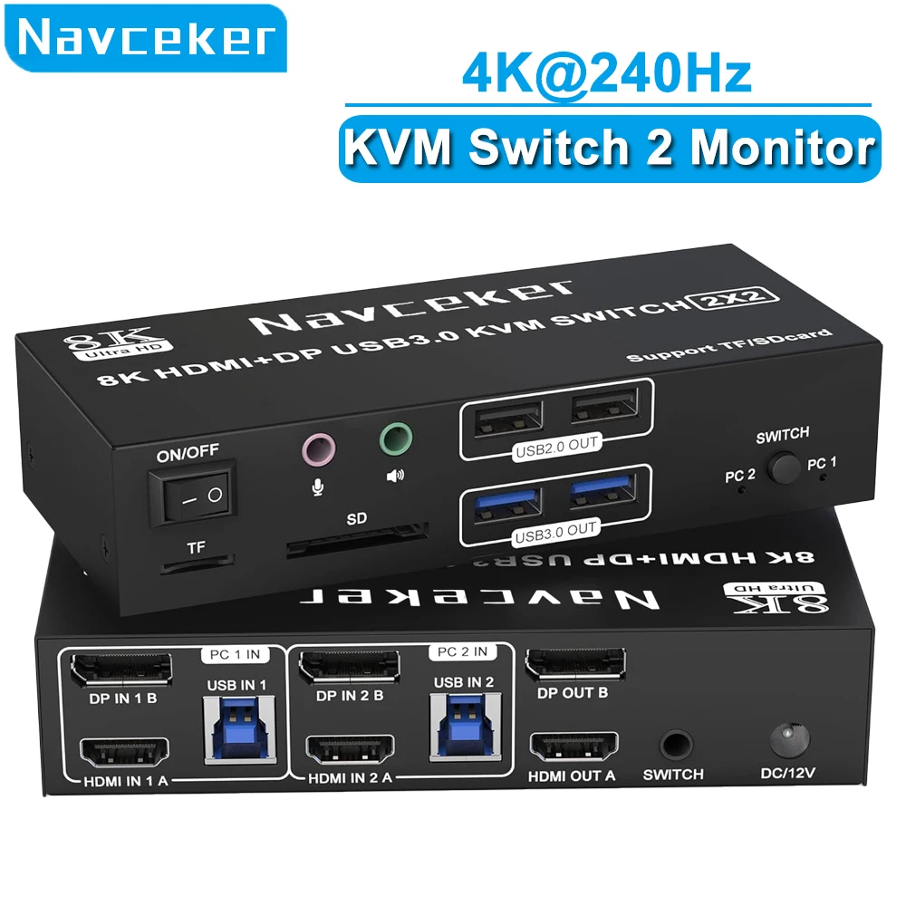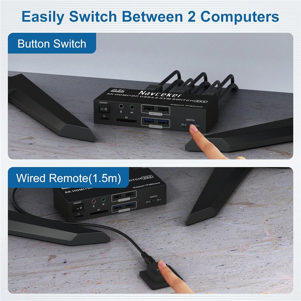 ZY-SKD201, el conmutador KVM Navceker 8K HDMI 2.1 + DP 2.0 USB 3.0 le permite compartir un teclado USB, un mouse USB y un monitor HDMI y un monitor DP para controlar 2 computadoras, computadoras portátiles y consolas de juegos con modo extendido y espejo. modo.