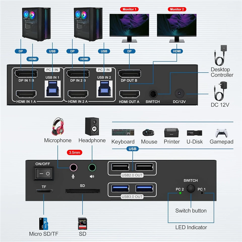 Conmutador KVM Monitor dual HDMI Displayport: este conmutador KVM dual Displayport 2 monitores 2 computadoras le permite controlar 2 computadoras con solo un conjunto de teclado y mouse, y compartir no solo dos monitores HD y 4 dispositivos USB, sino también 3.Micrófono de audio de 5 mm y lector de tarjetas SD TF.Este conmutador KVM de pantalla dual de 2 puertos admite modo extendido y de copia (solo disponible en hosts que admiten pantalla dual).Satisfaga sus necesidades de cambiar libremente entre computadoras de trabajo y computadoras personales.Tenga en cuenta: la computadora y el monitor a utilizar deben venir con un puerto HDMI y un puerto DP, y el uso de cables de conversión HDMI a DP y DP a HDMI no es compatible.