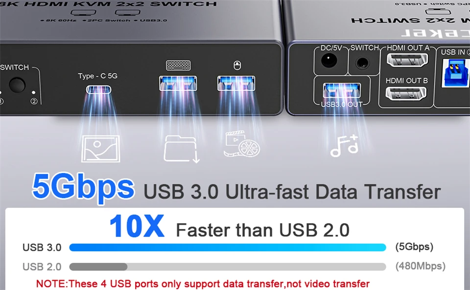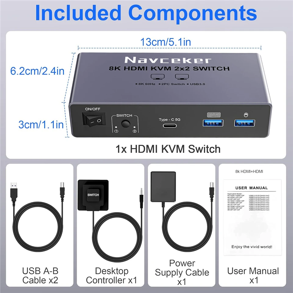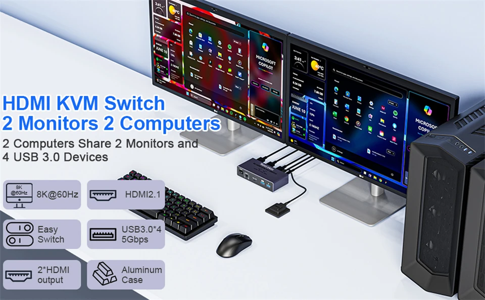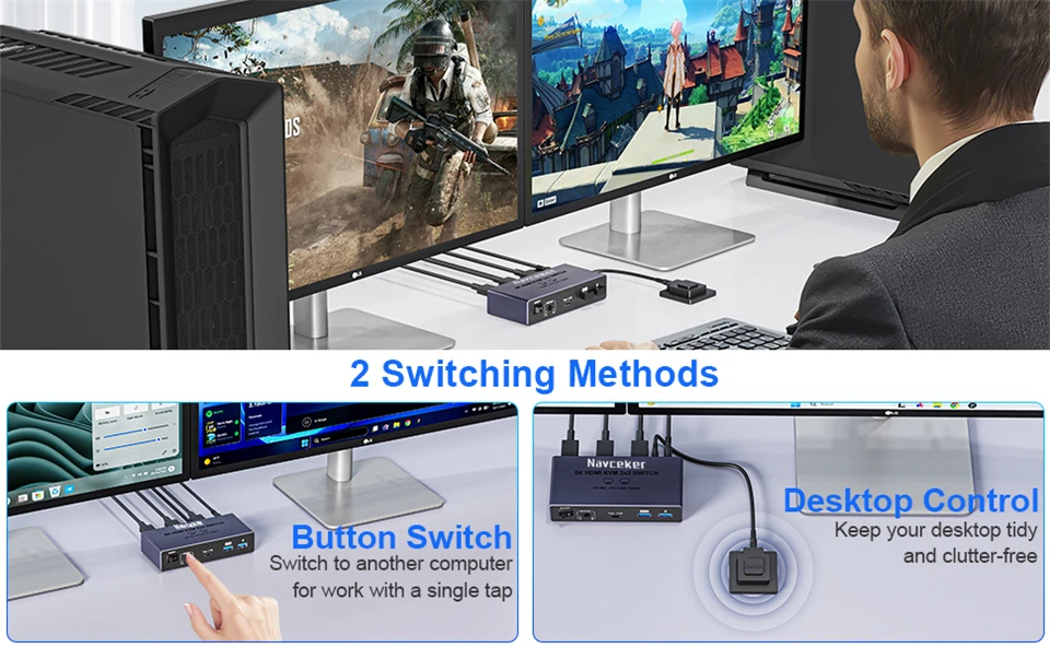 ZY-SK202, Navceker 8K HDMI 2.1 USB 3.0 KVM Switch le permite compartir un teclado USB, un mouse USB y dos monitores HDMI para controlar 2 computadoras, portátiles y consolas de juegos con modo extendido y modo espejo.