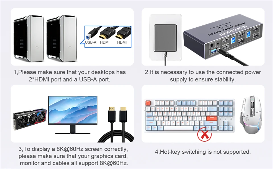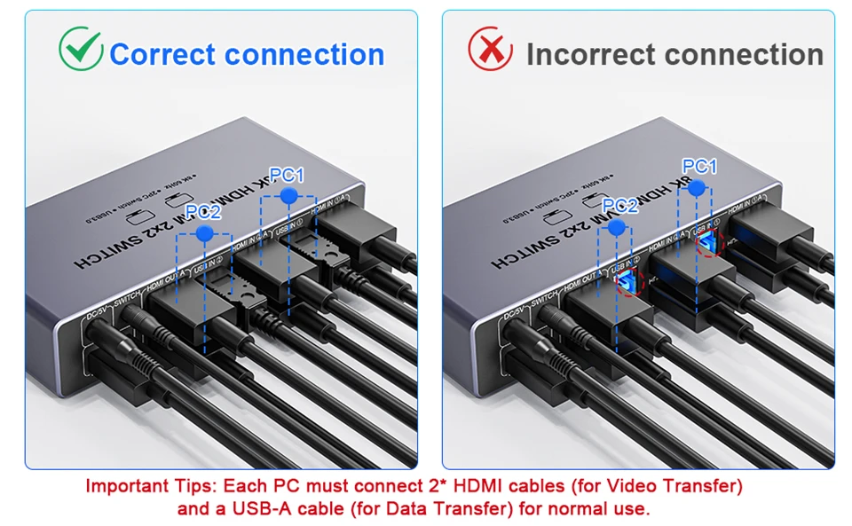 📂NOTA: 1. Asegúrese de que cada una de sus computadoras pueda admitir visualización en pantalla dual al mismo tiempo.2. Asegúrese de que su computadora tenga 2 puertos HDMI + 1 puerto USB-A.3. Cada computadora debe conectar 2 cables HDMI + 1 cable USB-A para garantizar que funcione correctamente.4. Los dos monitores solo pueden emitir la fuente de video desde una computadora y no pueden emitir la fuente de señal de PC1 y PC2 al mismo tiempo.5. Para garantizar un uso normal, asegúrese de conectar la fuente de alimentación a través del adaptador de corriente.