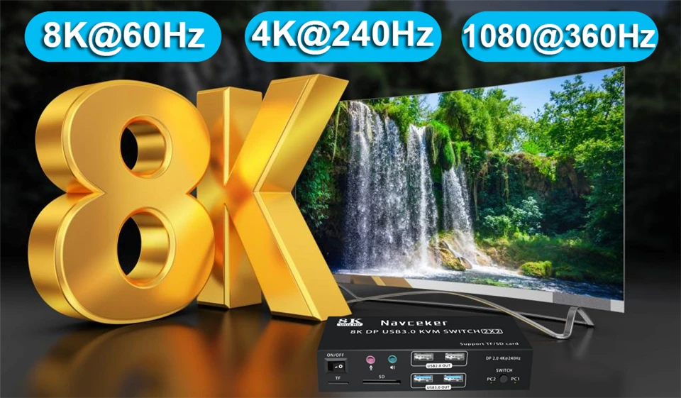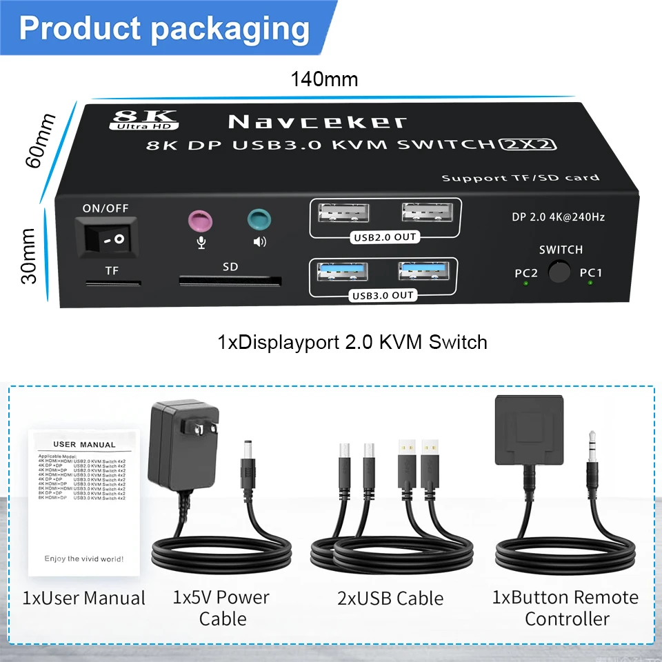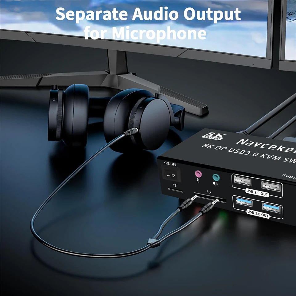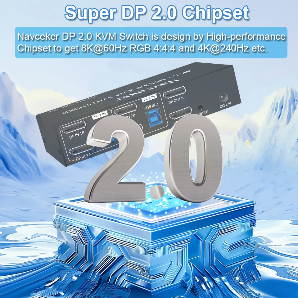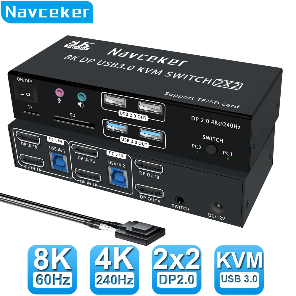 ZY-SKD200, Navceker 8K 60Hz DP 2.0 USB 3.0 KVM Switch le permite compartir un teclado USB, un mouse USB y dos monitores DP para controlar 2 computadoras, computadoras portátiles y consolas de juegos con modo extendido y modo espejo.
