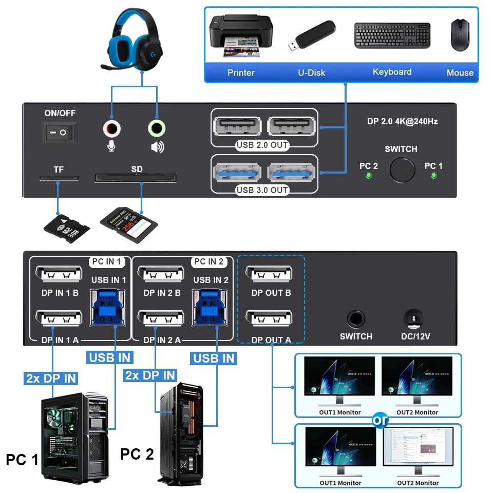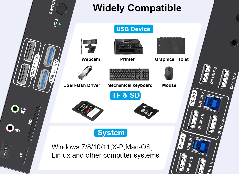 [Conmutador KVM DP dual con 2 puertos USB 2.0 y 2 puertos USB 3.0] - Admite la conexión de su dispositivo con puerto USB 3.0/USB 2.0 como teclado mecánico, mouse Bluetooth, escáner, controlador USB, impresora 3D, cámara USB