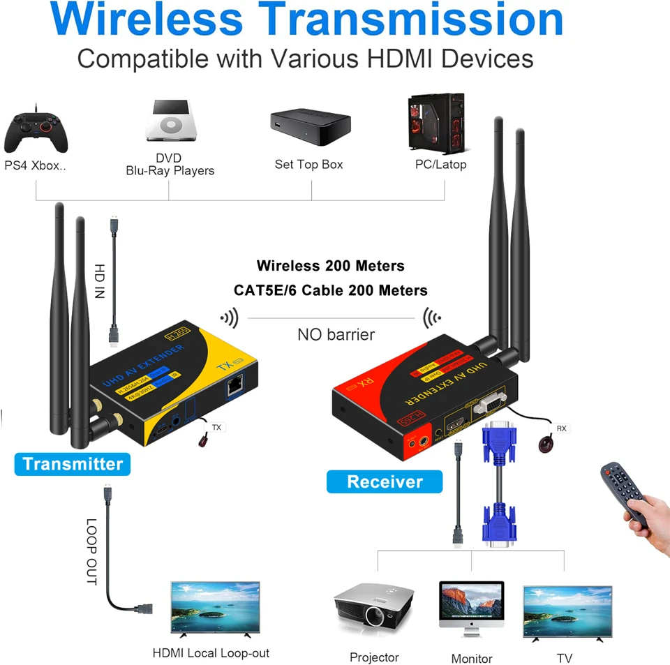 Navceker Transmisor y receptor de vídeo HDMI inalámbrico 4K 5G 200M 1080P Extensor HDMI RJ45 Múltiples pantallas para cámara NVR Laptop PC HDTV