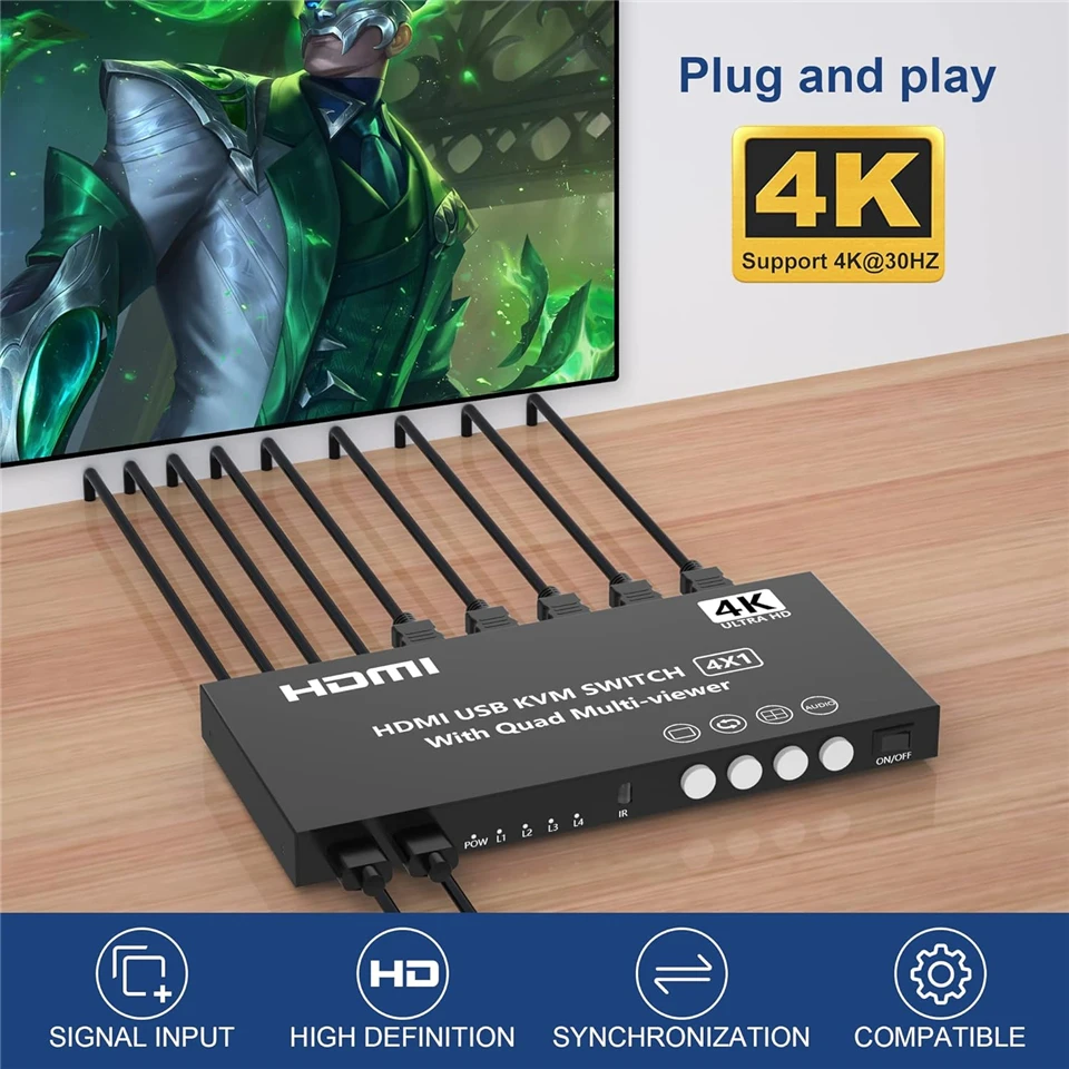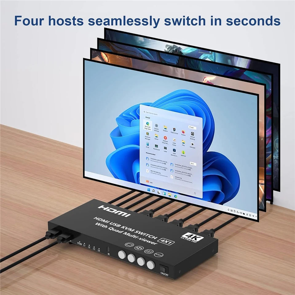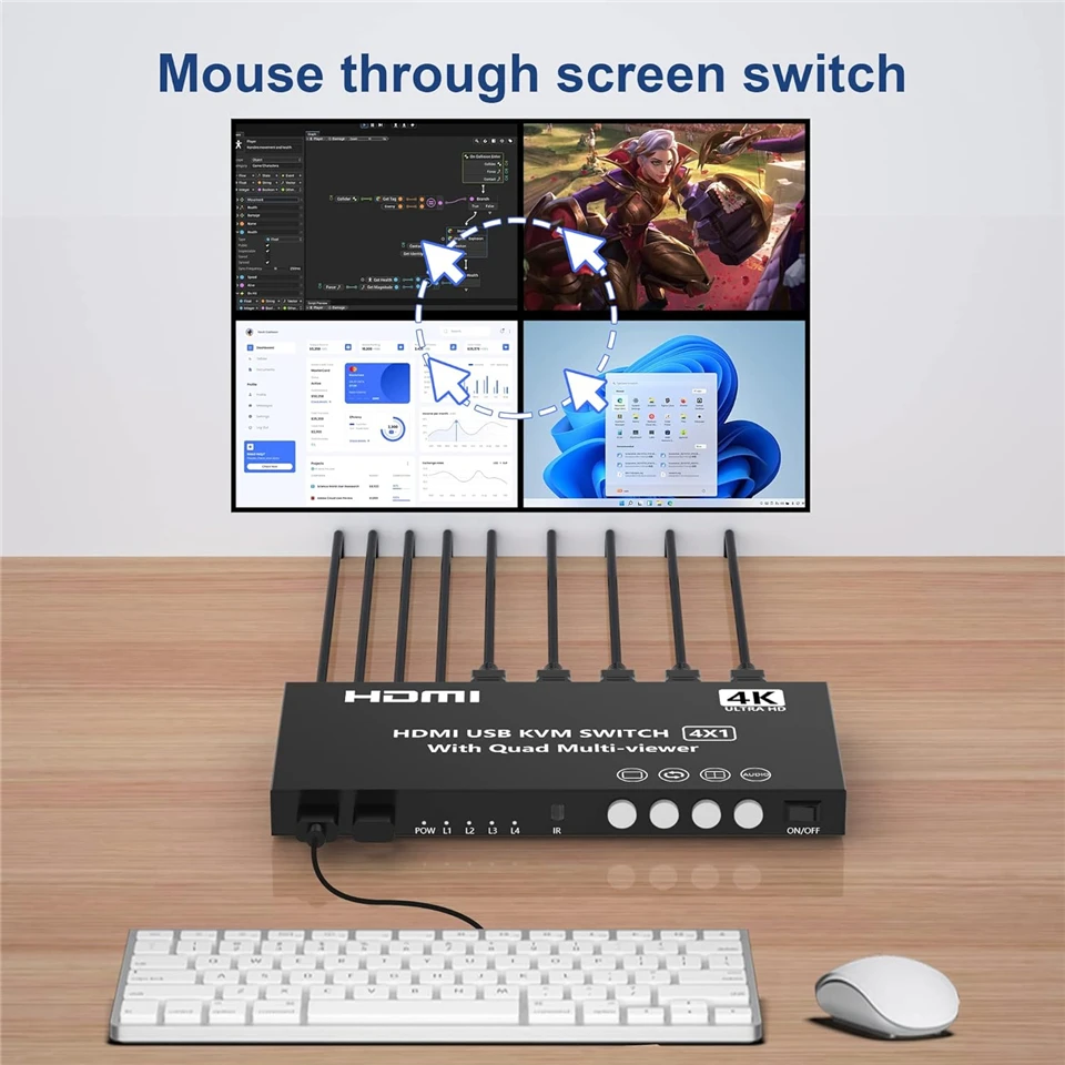Conmutador KVM HDMI 4K 4x1 con multivisualizador Quad 4 en 1 salida Multivisor HDMI Conmutador USB 4 en 1 salida para teclado de ratón compartido de 4 PC
