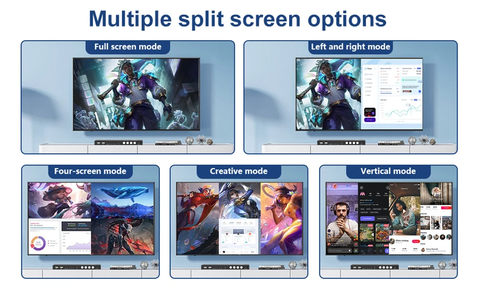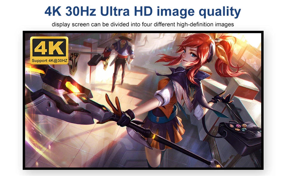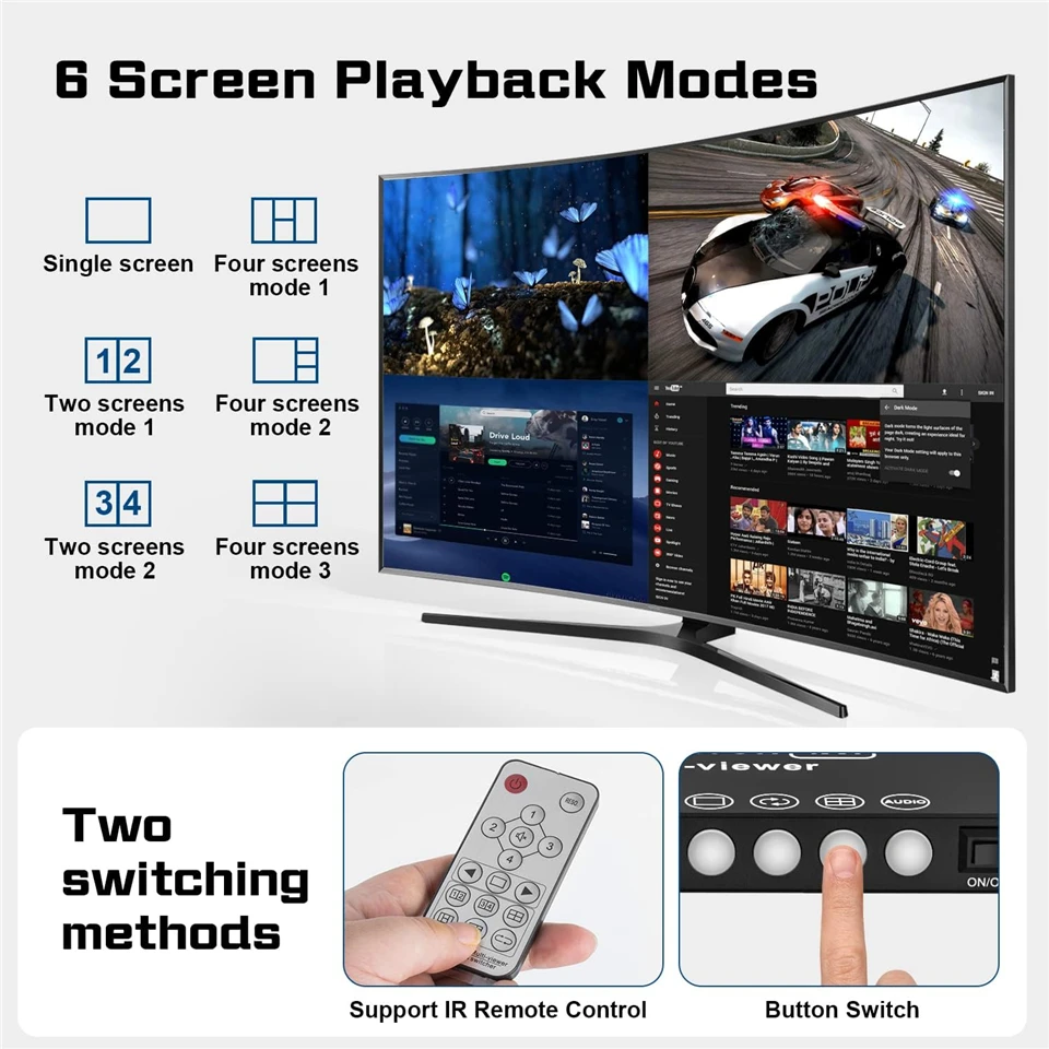 📂4K@30Hz, 1080P, 720P, puede mostrar 4 señales de vídeo digital HD en la misma pantalla y tiene una variedad de segmentación de vídeo, cambiando sin problemas 4 señales de entrada HD de forma sincrónica.