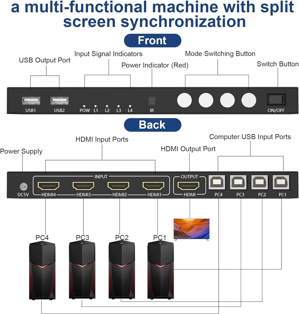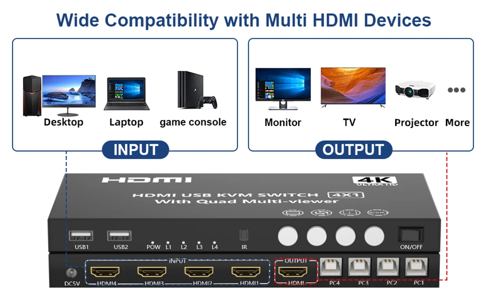 【Visor múltiple HDMI 4x1】El conmutador de visualizador múltiple HDMI admite 4 fuentes de entrada HDMI para una sola pantalla, lo que le permite ver una sola fuente, 2 fuentes o las 4 fuentes al mismo tiempo en la pantalla.Es perfecto para conectar 4 computadoras de escritorio o portátiles con solo 1 juego de teclado, mouse y 1 monitor para configuración del hogar y la oficina, consolas de juegos y dispositivos de transmisión.