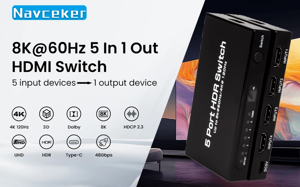 ZY-AQ8-5, el conmutador HDMI Navceker 8K@60Hz 4K@120Hz puede conectar 5 fuentes HDMI como reproductor de rayos azules y PS3, PS4, PS4 pro, PS5, etc., a una única pantalla HDMI como HDTV.y puede cambiar las fuentes HD de manera muy conveniente usando el control remoto IR o el botón de cambio de fácil clic en la unidad.El sistema es compatible con HDMI 2.1, 3D y 8K Ultra HD.