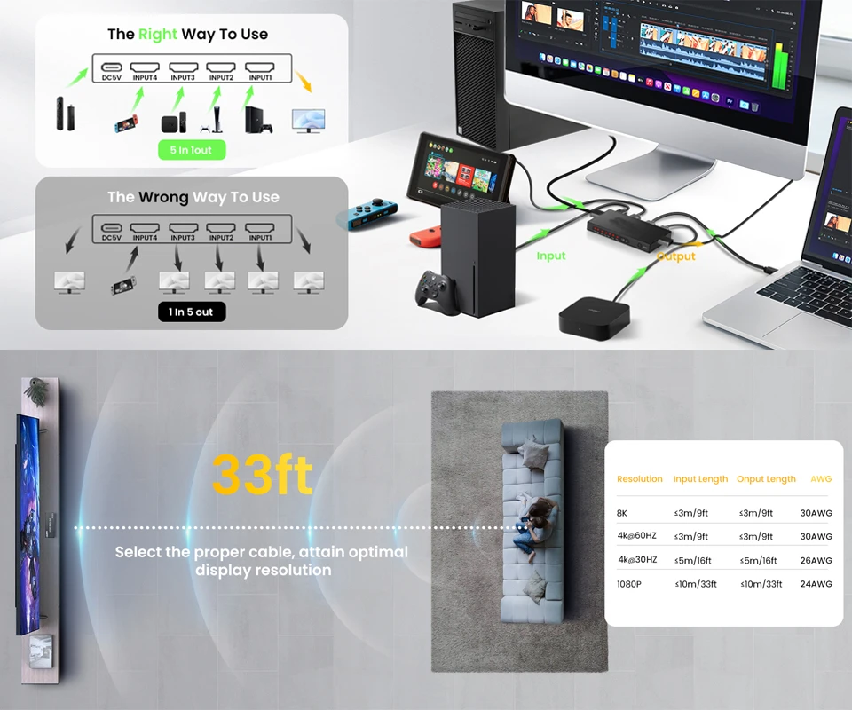 【Conmutador HDMI 8K 5 en 1 salida】El conmutador HDMI admite la conexión de 5 fuentes HDMI a 1 pantalla HDMI, lo que permite una conmutación perfecta entre las 5 fuentes HDMI.Evita la necesidad de conectar y desconectar constantemente los cables, reduciendo el desgaste y prolongando la vida útil de los dispositivos.Es la elección perfecta para oficinas, cines en casa y más.