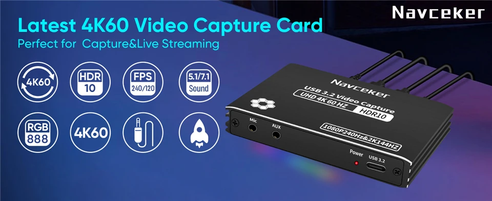 Navceker-Tarjetas de captura de vídeo USB 3,2 HDMI, HDMI a USB 3,2, 4K, 60fps, 2K, 144fps, 1080P @ 240fps, grabación a través de videocámara DSLR, cámara de acción a PC o Mac