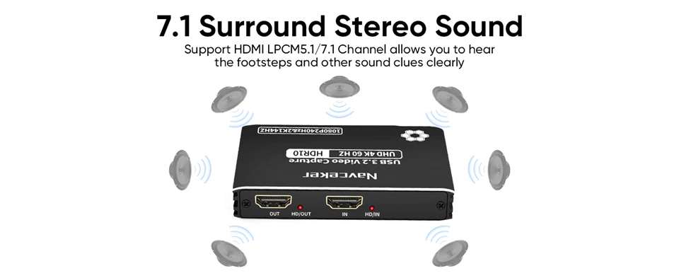 La Tarjeta de captura de vídeo Navceker compatible con HDMI LPCM5.1/7,1 canales le permite escuchar los pasos y otras pistas de sonido claramente, conecte los auriculares a través del puerto de 4 polos de 3,5mm para chatear en tiempo real y una excelente experiencia de juego. Admite dispositivos mezcladores de audio para proporcionar mejores efectos de sonido para su transmisión en vivo o juegos