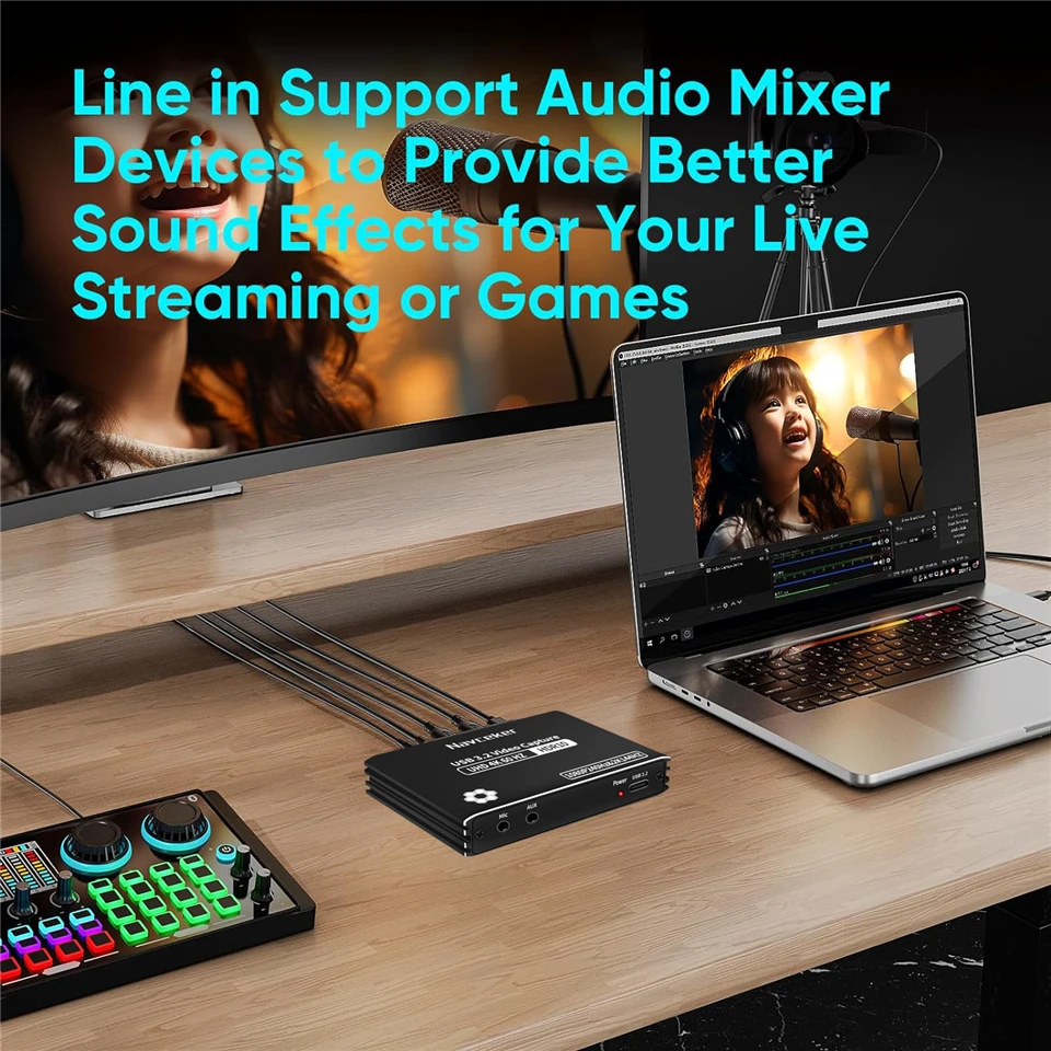 La Tarjeta de captura de vídeo Navceker compatible con HDMI LPCM5.1/7,1 canales le permite escuchar los pasos y otras pistas de sonido claramente, conecte los auriculares a través del puerto de 4 polos de 3,5mm para chatear en tiempo real y una excelente experiencia de juego. Admite dispositivos mezcladores de audio para proporcionar mejores efectos de sonido para su transmisión en vivo o juegos