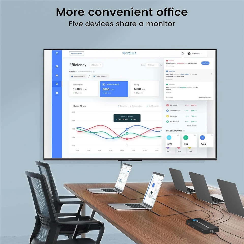 El conmutador HDMI Navceker 8K @ 60Hz 4K @ 120Hz puede conectar 5 fuentes HDMI como reproductor blu-ray y PS3, PS4, PS4 Pro, PS5, etc. A una sola pantalla HDMI como HDTV. Y puede cambiar las fuentes HD muy convenientemente usando el control remoto IR o el botón de interruptor de clic fácil en la unidad. El sistema es compatible con HDMI 2,1, 3D y 8K Ultra HD.