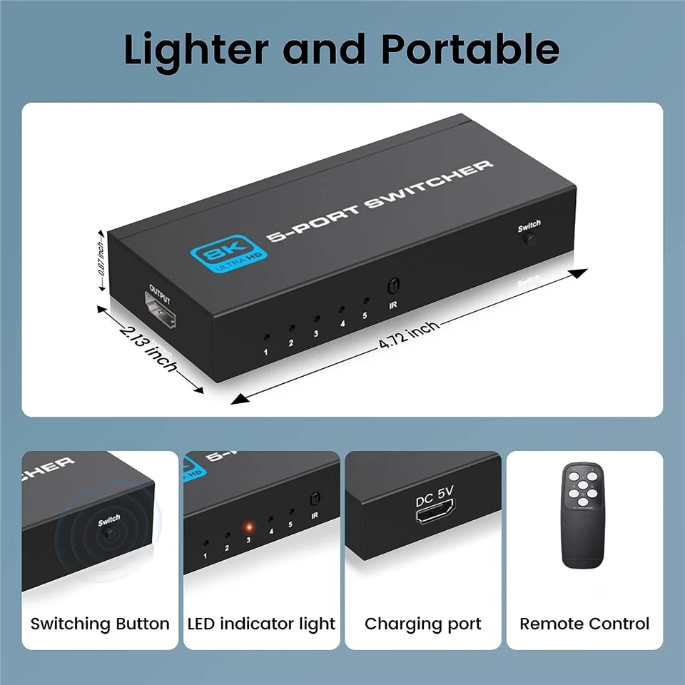 Comprar Navceker-conmutador HDMI 2,1, 8K, 60Hz, 4k120Hz, compatible con HDMI, salida 5 en 1, convertidor de Control remoto para monitores Xbox PS5