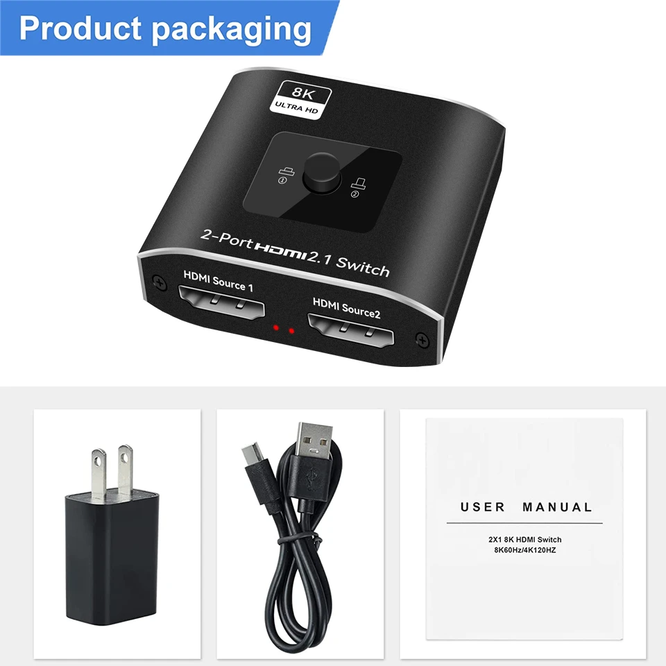 ★【LO QUE OBTIENE】-1*2x1 interruptor HDMI 2,1, 1 * cable de alimentación DC 5V, 1 * manual de usuario y garantía duradera. Exquisita caja de interruptores compacta de solo 0,1 libras de peso, el tamaño es de 2,09*2,05*0,83 pulgadas, puede esconderse detrás de otros dispositivos, no ocupará demasiado espacio.★NOTA: para algunos dispositivos de alto consumo de energía, puede tardar 3-6 segundos en cambiar manualmente la fuente de señal. Si tiene alguna pregunta o inquietud, no dude en ponerse en contacto con nosotros, le daremos una respuesta satisfactoria en un plazo de 24 horas.