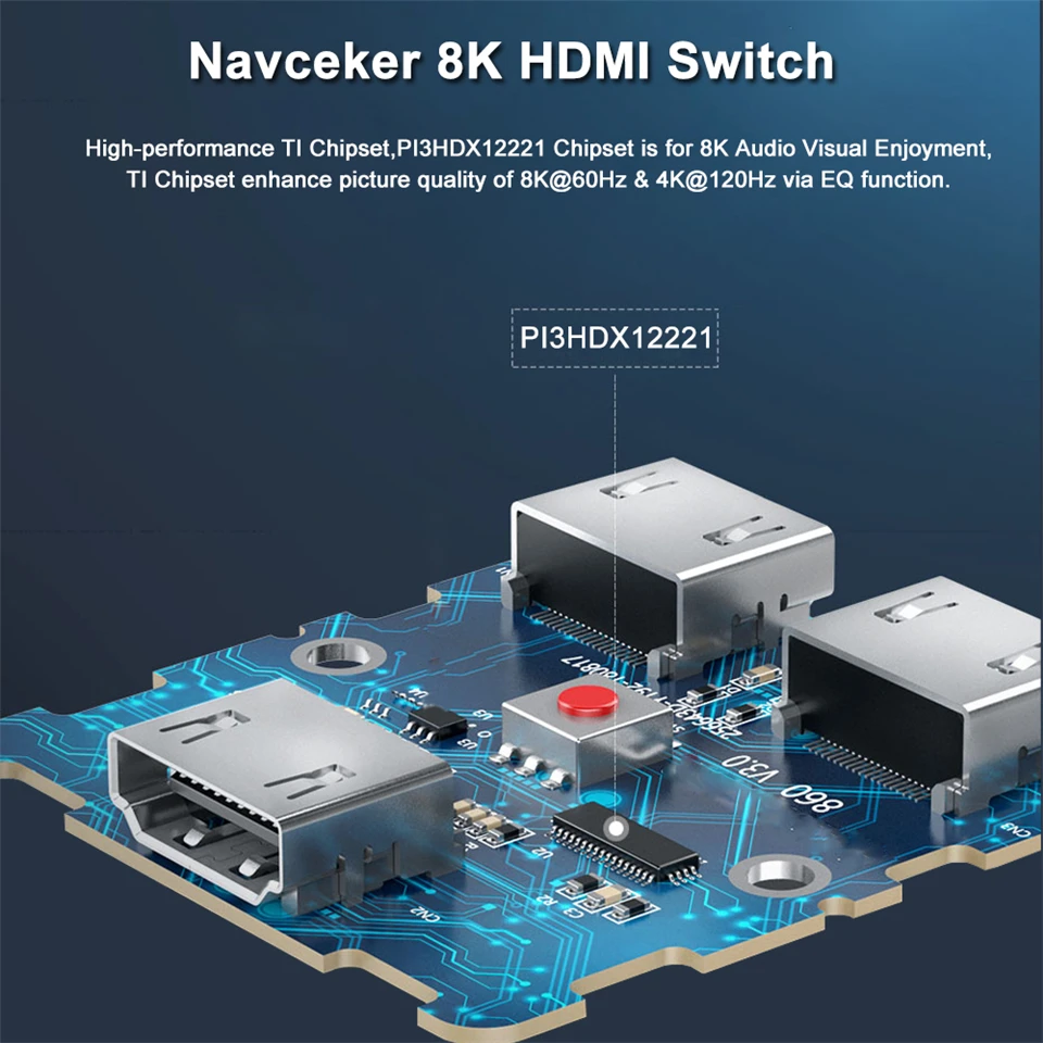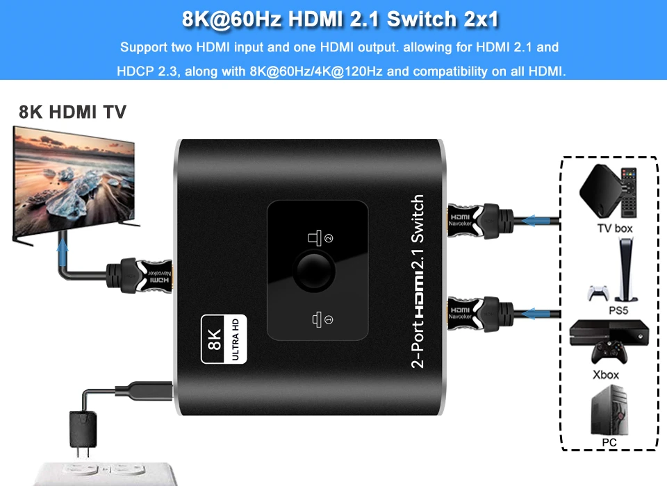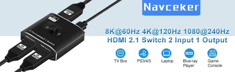 Navceker 8K @ 60Hz 4K @ 120Hz HDMI Switch puede conectar dos fuentes HDMI como reproductor de Blu-ray y PS3, PS4, PS4 Pro, PS5, etc. A una sola pantalla HDMI como HDTV. Y puede cambiar las fuentes HD muy convenientemente usando el botón de interruptor de clic fácil en la unidad. El sistema es compatible con HDMI 2,1, 3D y 8K Ultra HD.