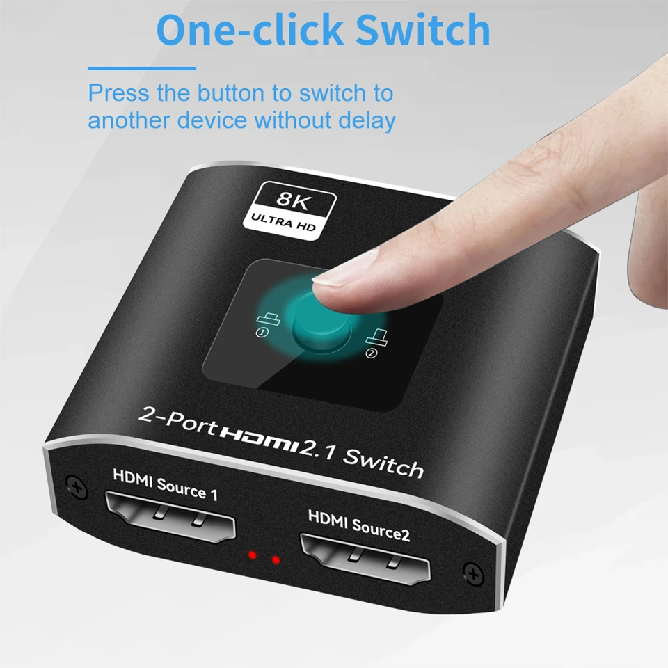 Nuevo conmutador 8K compatible con HDMI 2,1 Switch Splitter 2 en 1 Out Ultra HD 8K @ 60Hz 4K @ 120Hz Adaptador de interruptor de alta velocidad 48Gbps con botón de interruptor para computadora portátil 2 fuentes a 1 PANTALLA