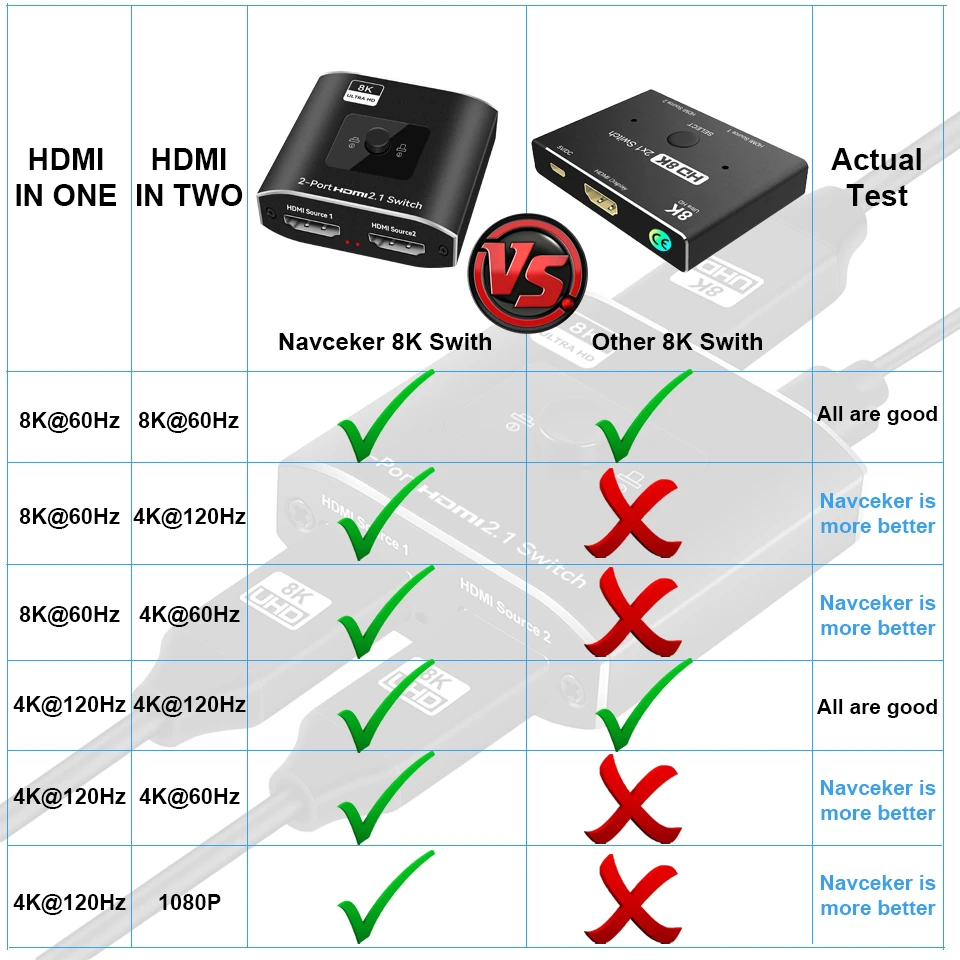 →Prueba real: Navceker 8K HDMI Switch con Apple TV Box,PS4, PS5 Pro, ordenador con tarjeta de vídeo RTX3090 y LG 8K HDMI TV. Resolución diferente y dispositivo diferente para probar tres veces antes de la entrega.