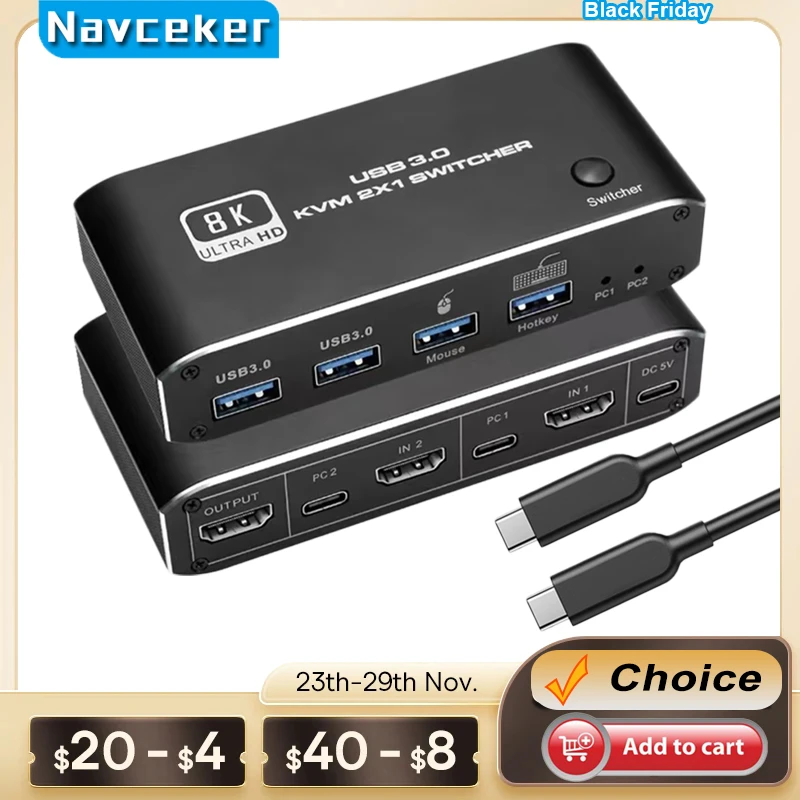 El conmutador KVM USB Navceker 8K HDMI te permite compartir un teclado USB, un ratón USB y un monitor HDMI para controlar 2 ordenadores, portátiles y consolas de juegos.