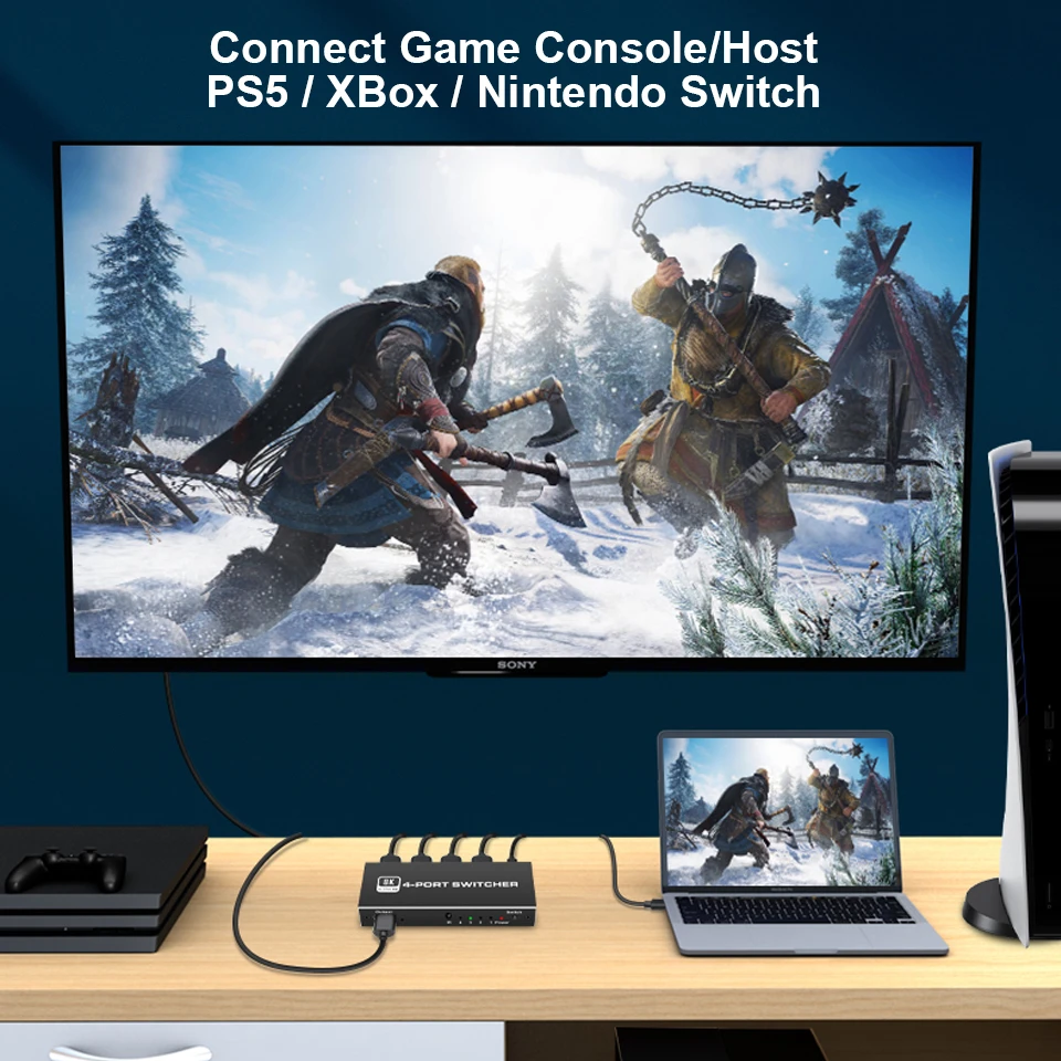 El interruptor HDMI Navceker 8K @ 60Hz 4K @ 120Hz puede conectar cuatro fuentes HDMI como el reproductor Blu-ray y PS3, PS4, PS4 Pro, PS5, etc. A una sola pantalla HDMI como HDTV. Y puede cambiar las fuentes HD muy convenientemente usando el control remoto IR o el botón de interruptor de clic fácil en la unidad. El sistema es compatible con HDMI 2,1, 3D y 8K Ultra HD.