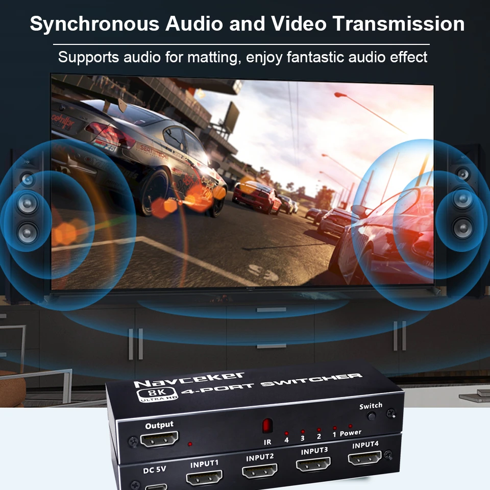 El interruptor HDMI Navceker 8K @ 60Hz 4K @ 120Hz puede conectar cuatro fuentes HDMI como reproductor de Blu-ray y PS3, PS4, PS4 Pro, PS5, etc. A una sola pantalla HDMI como HDTV. Y puede cambiar las fuentes HD muy convenientemente usando el control remoto IR o el botón de interruptor de clic fácil en la unidad. El sistema es compatible con HDMI 2,1, 3D y 8K Ultra HD.