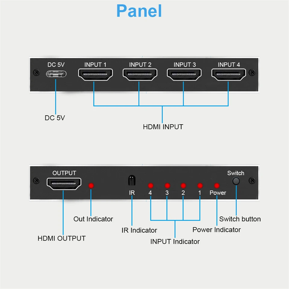 HDMI 2,1 HDMI SWITCH 4 IN 1 OUT : 4 puertos HDMI de entrada y 1 salida HDMI para varios dispositivos HDMI, el conmutador HDMI 4 puertos puede funcionar con la mayoría de los dispositivos con interfaz HDMI estándar. Entrada: PC, ordenadores portátiles, Xbox 360, PS3/PS4/PS5, Roku Express, Amazon Fire TV Stick, Blu-ray DVD, etc. Salida: televisores Full HD, proyectores, monitores y más.