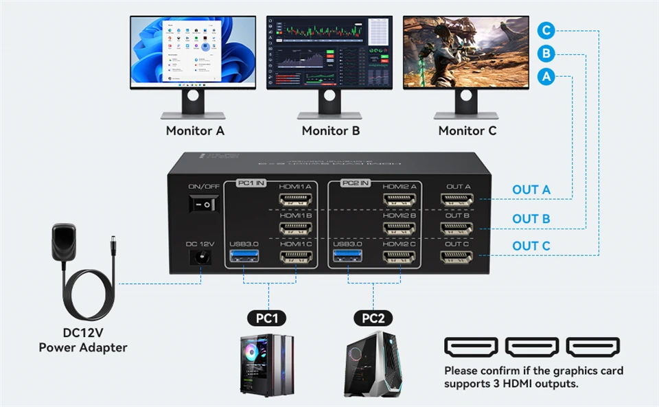 Los 3 monitores requieren 3 conexiones HDMI desde cada ordenador al conmutador KVM. Cuando tanto la pantalla como la fuente de señal son compatibles con 8K @ 60Hz, el dispositivo puede proporcionar una experiencia 8K.