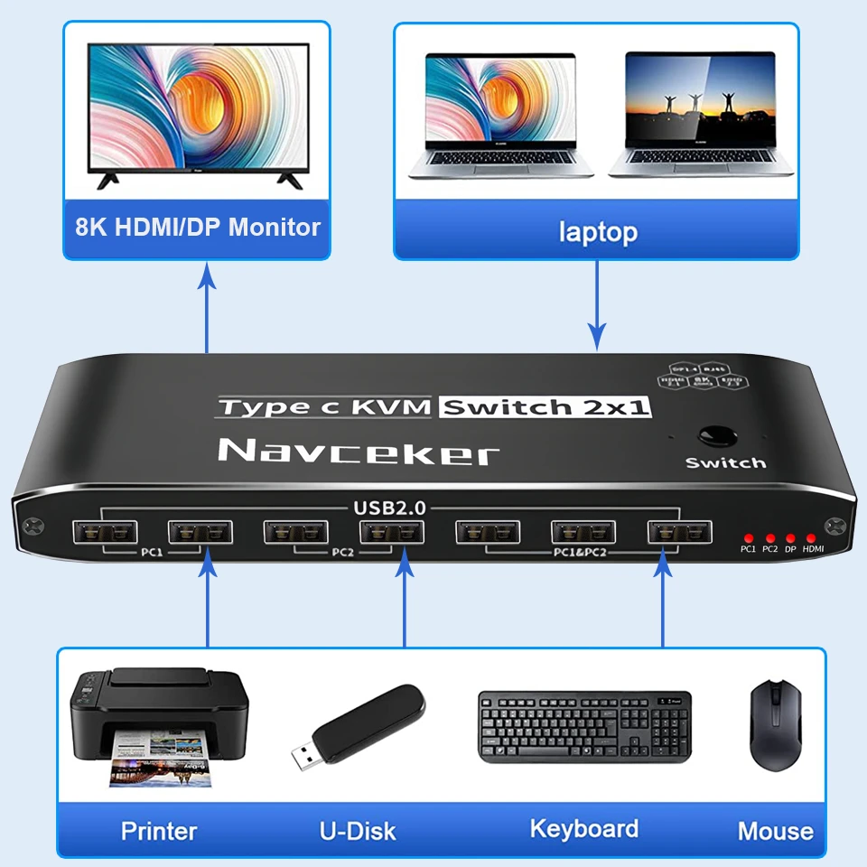 El conmutador KVM Navceker 8K USB C de 100W PD Charge le permite compartir un teclado USB, un mouse USB, 5 dispositivos USB 2,0, 1 x R45,1 Conector de 3,5mm y un monitor Displayport o HDMI para controlar 2 Macbook, ordenadores, portátiles, consolas de juegos.