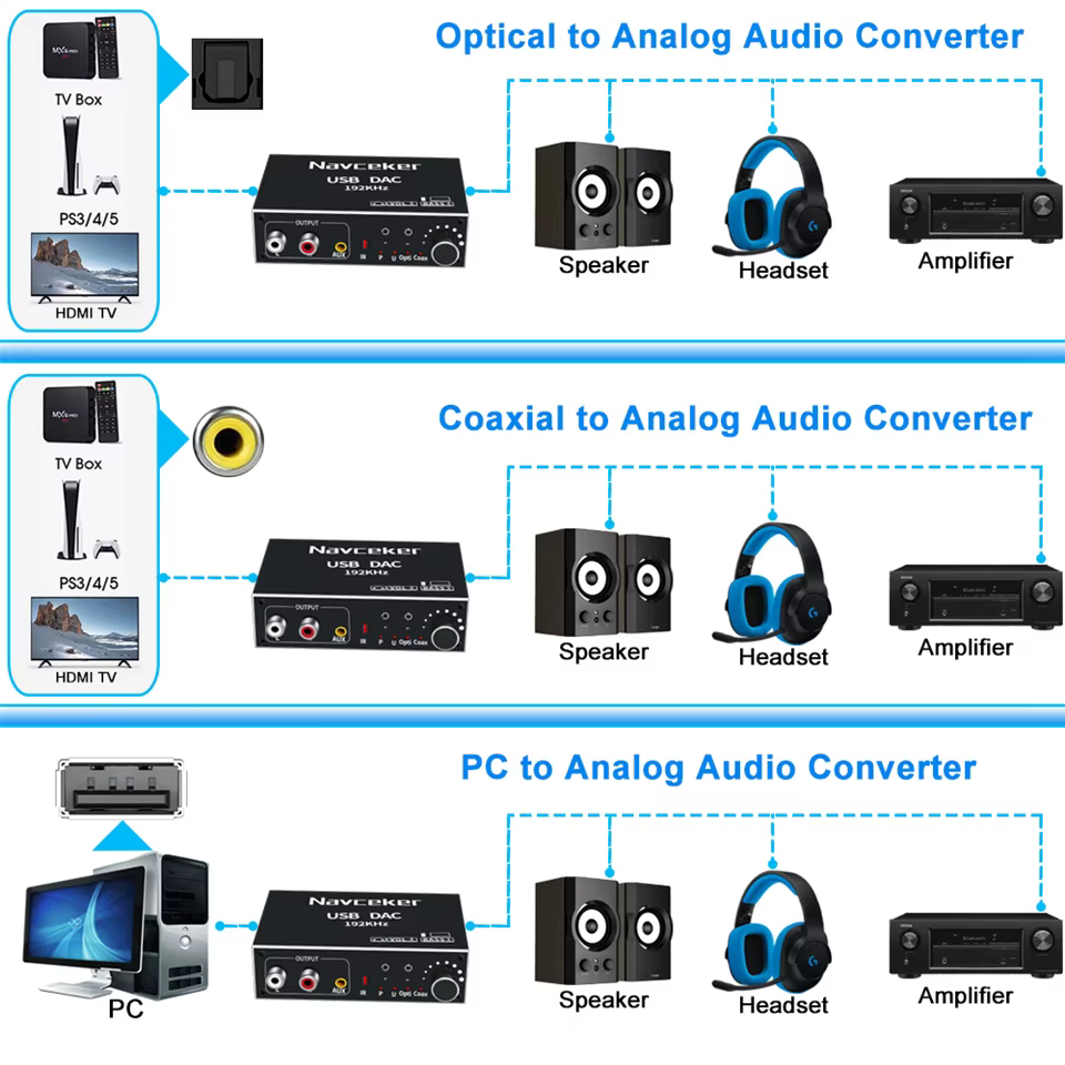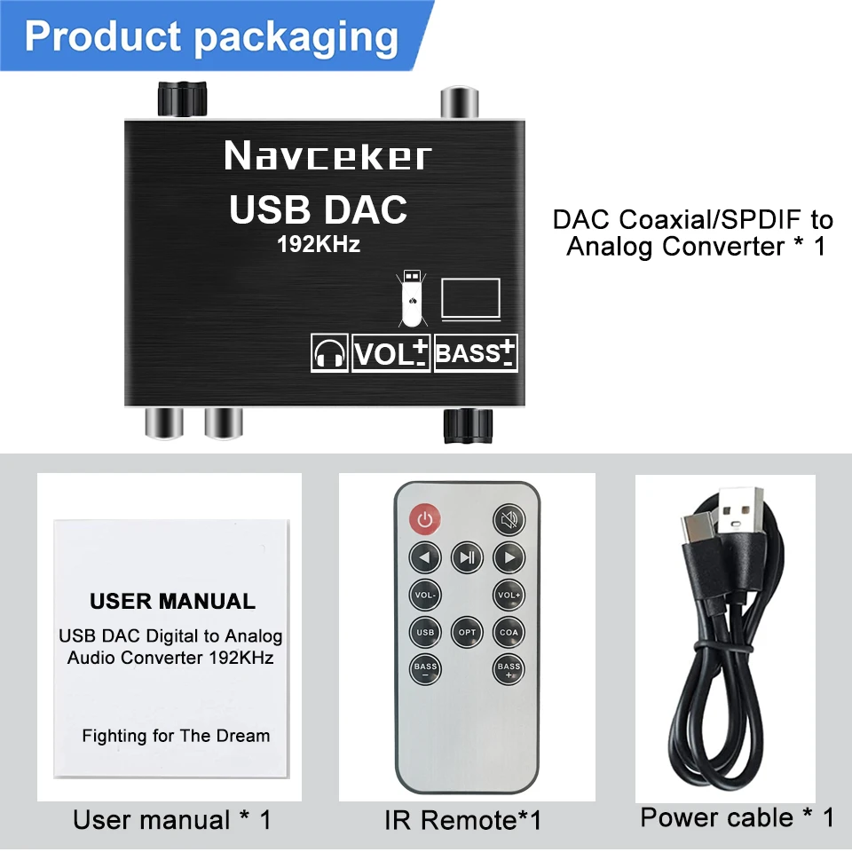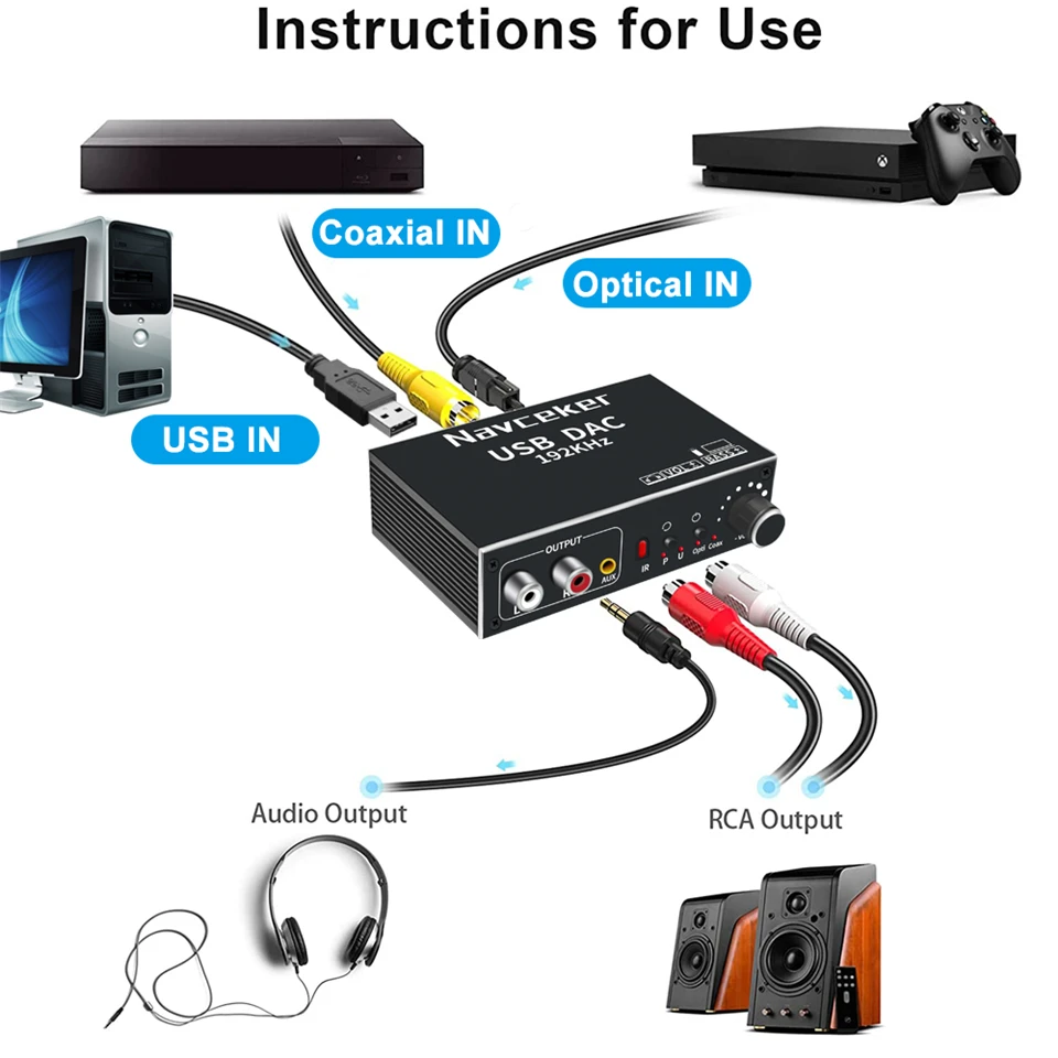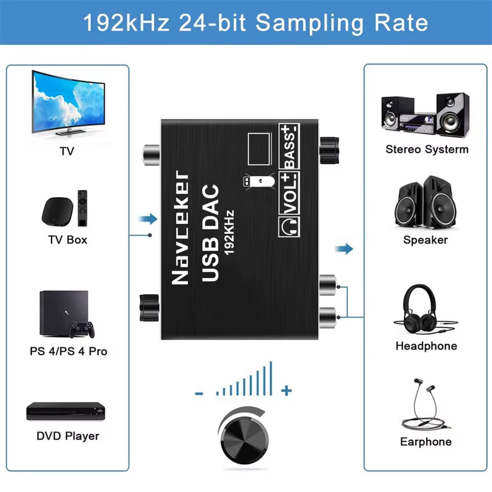 Convertidor de audio digital a analógico Navceker DAC, compatible con USB (para PC), SPDIF óptico y coaxial como entrada de audio, compatible con RCA(L/R) y conector de 3,5mm como salida de audio, tasas de muestreo de 192KHz y 24 bits.