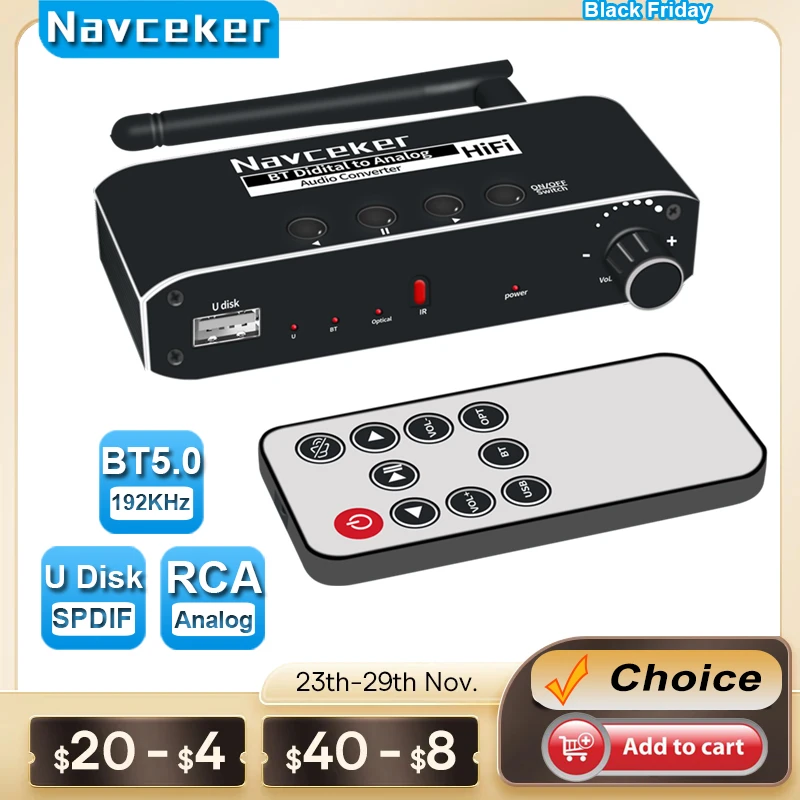 Convertidor digital a analógico Navceker de 192kHz con controlador DAC USB Digital Compatible con Bluetooth remoto Toslink a estéreo analógico L/R RCA