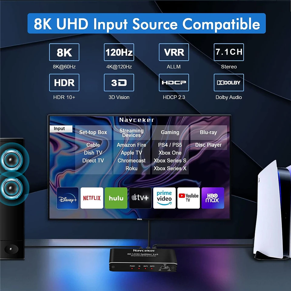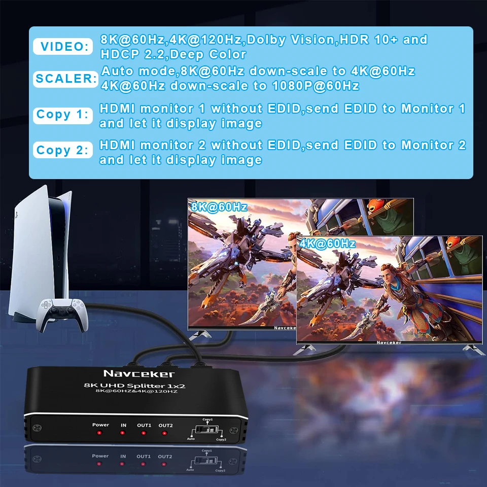 Navceker HDMI 2,1 Splitter 1 en 2 salidas puede duplicar fácilmente/reflejar 1 fuente HDMI a 2 pantallas simultáneamente. Compatible con HDCP 2,3 bypass 4K 120HZ 8K 120Hz VRR ALLM Dobly Atmos Dobly Visinon. Viene con gestión EDID, función de escalador descendente. Funciona muy bien con PS5, serie XBOX, Nintendo Switch, etc.