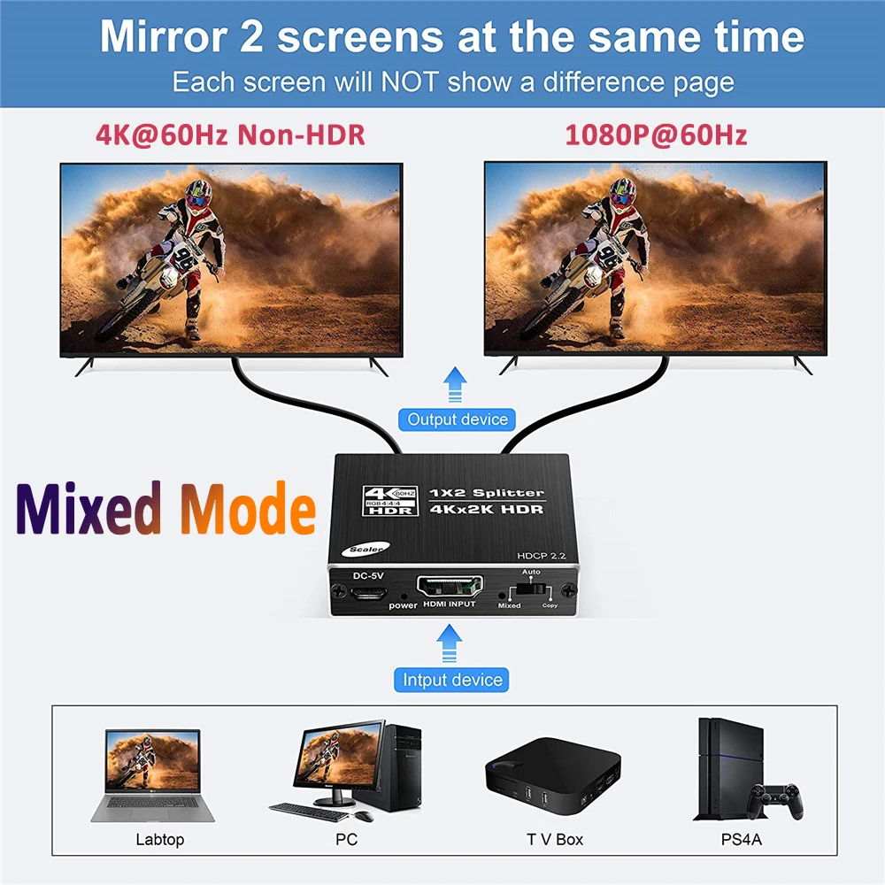 Admite modo mixto:1080P fijo de la salida HDMI 2. La salida HDMI emitirá una señal no HDR 4K @ 60Hz, la salida HDMI dos emitirá una señal full HD 1080P @ 60Hz.