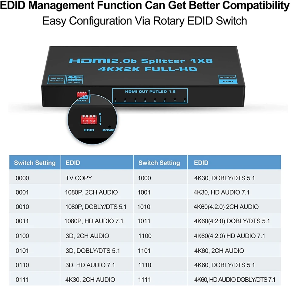 ★【Especificación HDMI 2.0b】Nuestro divisor HDMI 2.0b admite hasta 4K x 2K a 60Hz YUV4:4:4, HDR 4K(RGB 4:4:4),Ultra HD/3D; admite HDCP2.2 con ancho de banda de 18Gbps y color profundo de 30/36 bits. (NOTA: si su televisor solo admite YUV 4:2:0, aunque su televisor admite 4K, el televisor en realidad muestra 1080P en lugar de 4K)