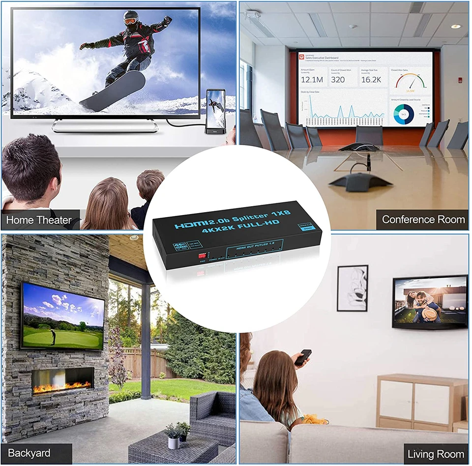 ★【Divisor HDMI 1X8】 El divisor HDMI 1X8 distribuye la señal de audio y video de una sola fuente a 8 pantallas HDMI simultáneamente sin ningún retraso, pantalla Flash y calidad de video reducida. Admite salidas de pantalla mixtas 4K y 1080p. Un dispositivo fuente de vídeo 4K puede mostrar simultáneamente contenido 4K en monitores 4K y contenido 1080p en monitores 1080p a través de la reducción de escala.