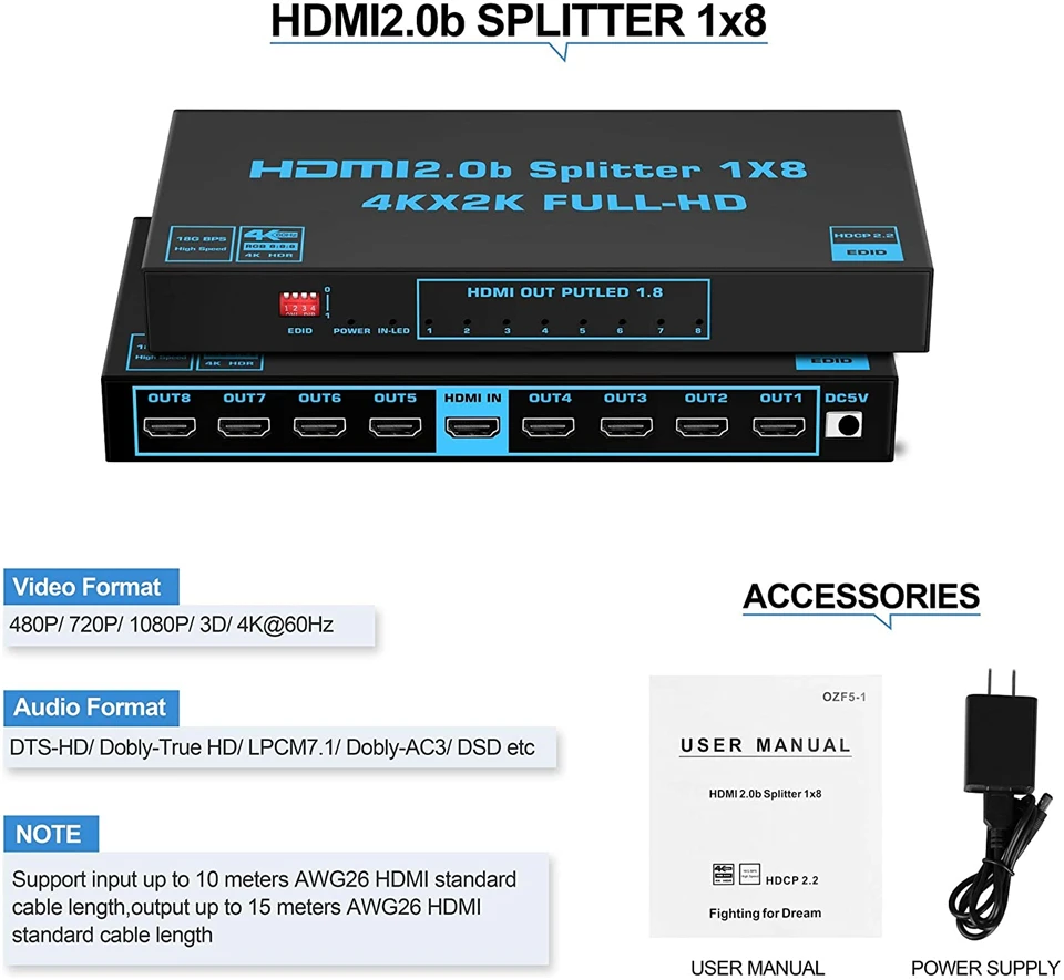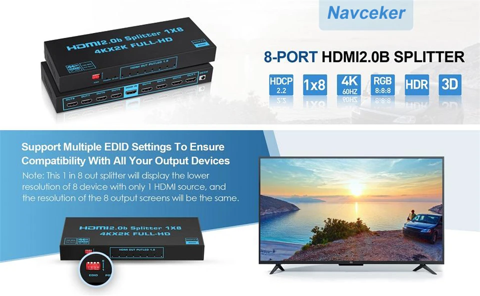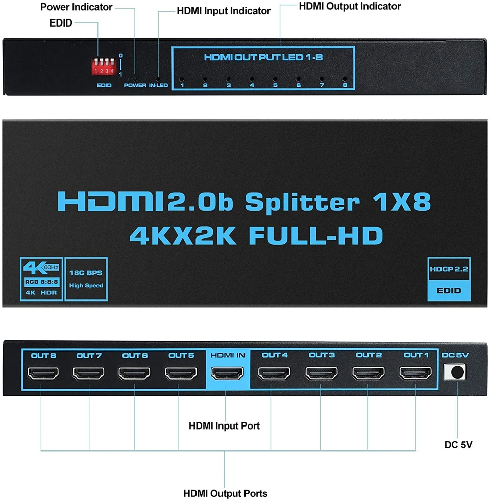 El divisor Navceker HDMI 2,0 utiliza una sola fuente HDMI, accediendo a múltiples disipadores HDMI. Permite dividir fácilmente un dispositivo HDMI en 8 monitores o proyectores compatibles con HDMI. Además, se puede colocar al final de un cable HDMI largo para regenerar la señal HDMI. La resolución de este divisor HDMI puede ser de hasta 3840x2160 @ 60Hz.