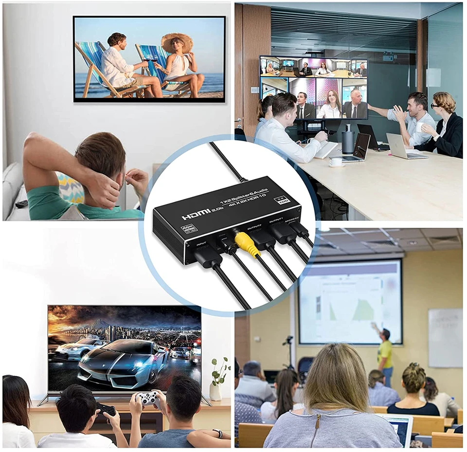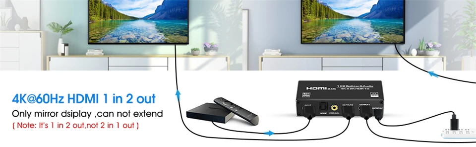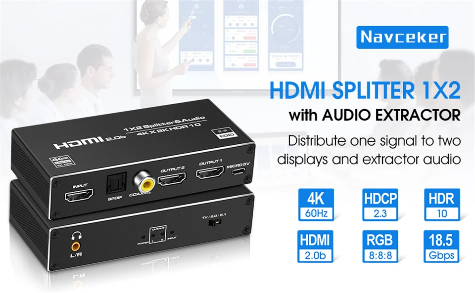 El Divisor de cable HDMI Navceker 4K @ 60Hz le permite mostrar UNA fuente HDMI en DOS pantallas y agrega un puerto de salida de audio L + R , SPDIF y Coaxial extra, de la marca Navceker, compatible con RGB 4:4:4/RGB8:8:8, 4K @ 60HZ/1080P @ 120Hz pantalla súper clara, hace que la imagen sea más clara y realista. El cable estándar Con AWG26(19 + 1) HDMI, cuando la resolución es de 1080P o menos, entrada y salida de hasta 50 pies (15m), cuando la resolución es de 4K, entrada arriba y salida a 26 pies (8m). Nota: este divisor HDMI 4K @ 60Hz no es un conmutador HDMI, no le permitirá cambiar varias fuentes HDMI en 1 televisor.