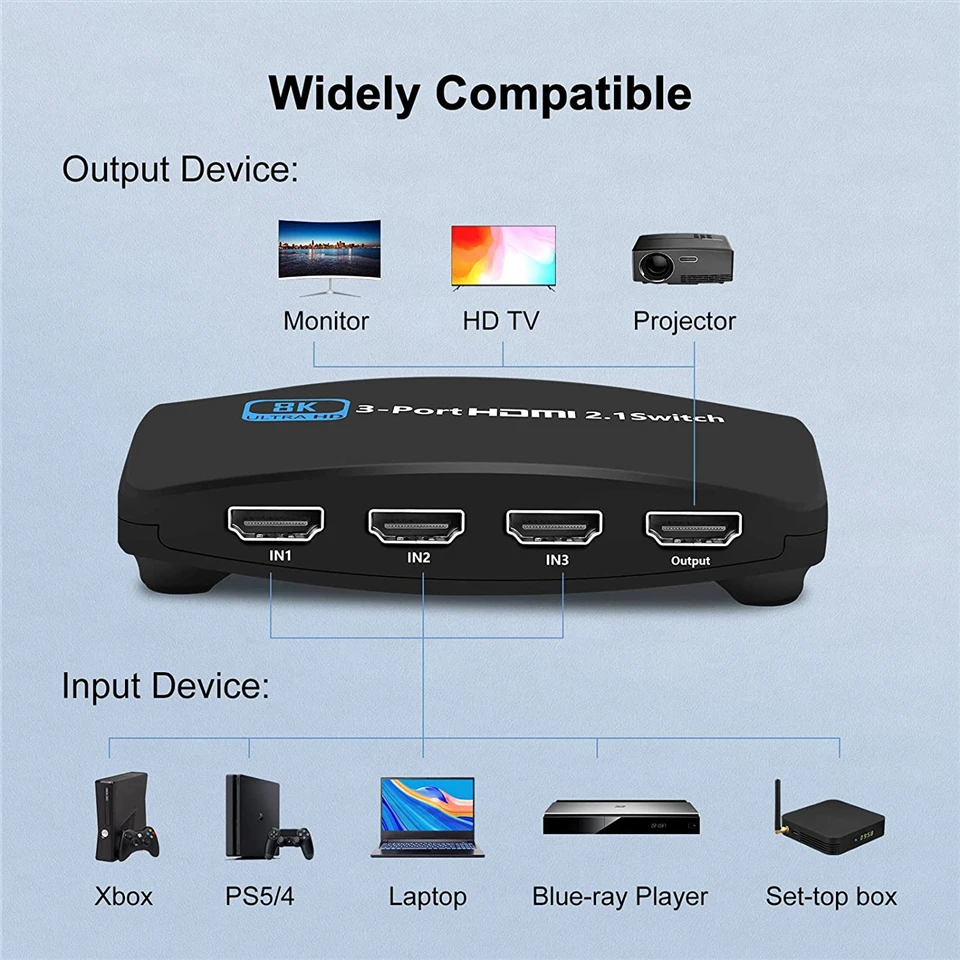 Interruptor HDMI 2,1 HDMI 3 en 1 salida: 3 puertos HDMI de entrada y 1 HDMI de salida para varios dispositivos HDMI, el conmutador HDMI de 3 puertos puede funcionar con la mayoría de los dispositivos con interfaz HDMI estándar. Entrada: PC, ordenadores portátiles, Xbox 360, PS3/PS4/PS5, Roku Express, Amazon Fire TV Stick, Blu-ray DVD, etc. Salida: televisores Full HD, proyectores, monitores y más.
