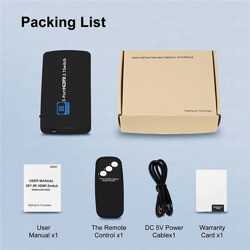 ZY-A8Q3, el interruptor HDMI Navceker 8K @ 60Hz 4K @ 120Hz puede conectar tres fuentes HDMI como el reproductor blu-ray y PS3, PS4, PS4 pro, PS5, etc. a una sola pantalla HDMI como HDTV.Y puede cambiar las fuentes HD muy cómodamente usando el control remoto IR o el botón interruptor de fácil clic en la unidad. El sistema es compatible con HDMI 2,1, 3D y 8K Ultra HD.