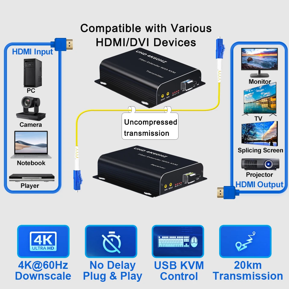 20Km 4K @ 60Hz HDMI Fibra óptica USB KVM Extender Video Transmisor Receptor HDMI Loop Over LC Cable de fibra para PS4 PS5 DVD PC a TV Monitor