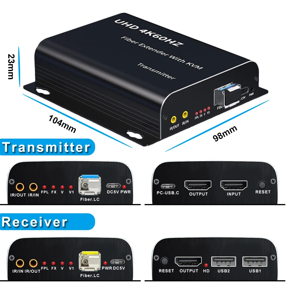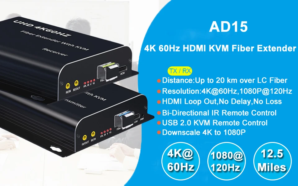 El extensor de fibra óptica Navceker HDMI proporciona una extensión de la señal de audio de video HDMI a largas distancias sobre un cable de fibra óptica LC, admite alta resolución de hasta 3840x2160 @ 60Hz,1080P @ 120Hz. También admite control KVM remoto, control IR bidireccional y función de bucle HDMI. El extensor se puede utilizar para una amplia gama de aplicaciones que requieren transmisión a larga distancia de alta resolución con alta calidad por su buena estabilidad y potente seguridad.