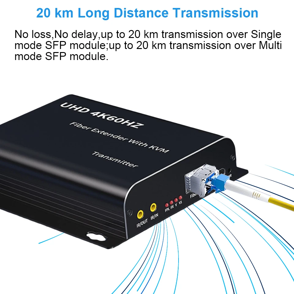 Para 0 km a 20km, no hay pérdida y cero retardo entre el transmisor de fibra HDMI y el receptor de fibra HDMI a través de la última tecnología sin comprimir.