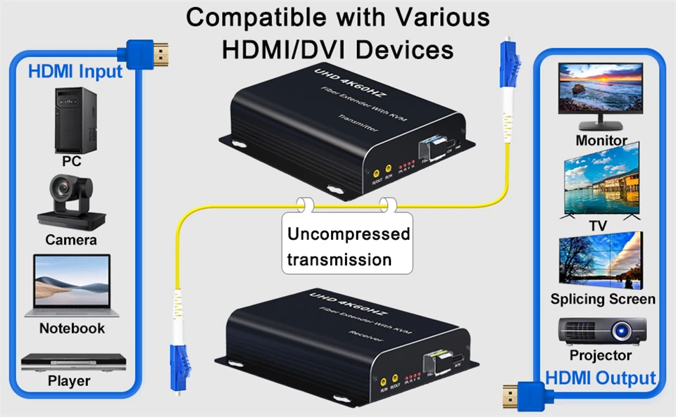 Navceker HDMI fibra KVM extensor podría transmitir señal de audio de vídeo HDMI hasta 20km/12,5 millas a través de cable de fibra monomodo o multimodo.