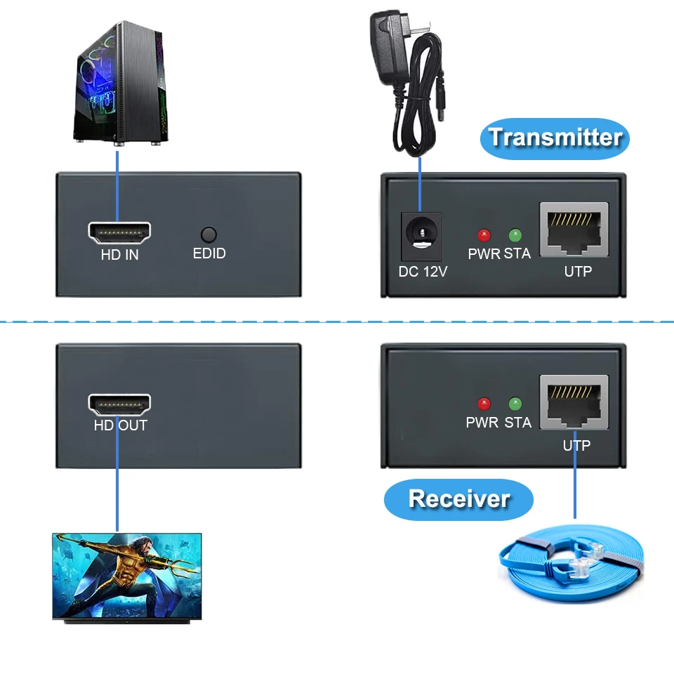 Sistema de protección ESD incorporado:Hacer la transmisión mucho más segura. Adaptador de extensión HDMI perfecto para casas grandes, fábricas, obras de construcción, centros de control de datos, etc.Plug and Play