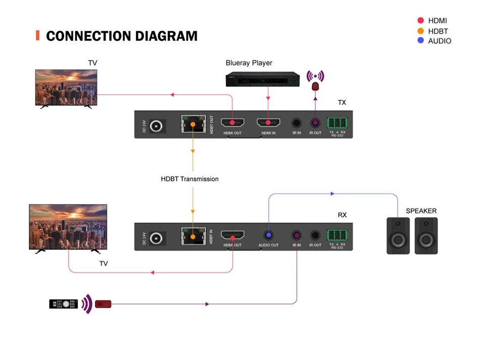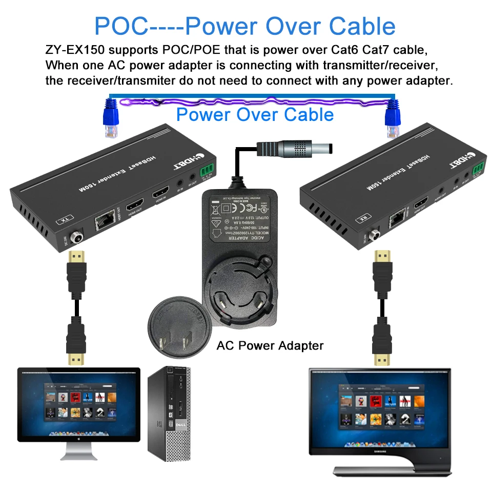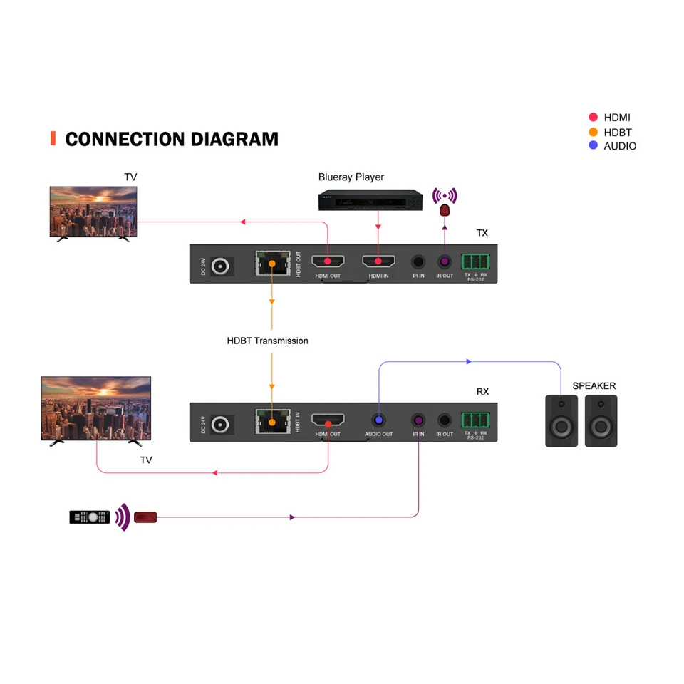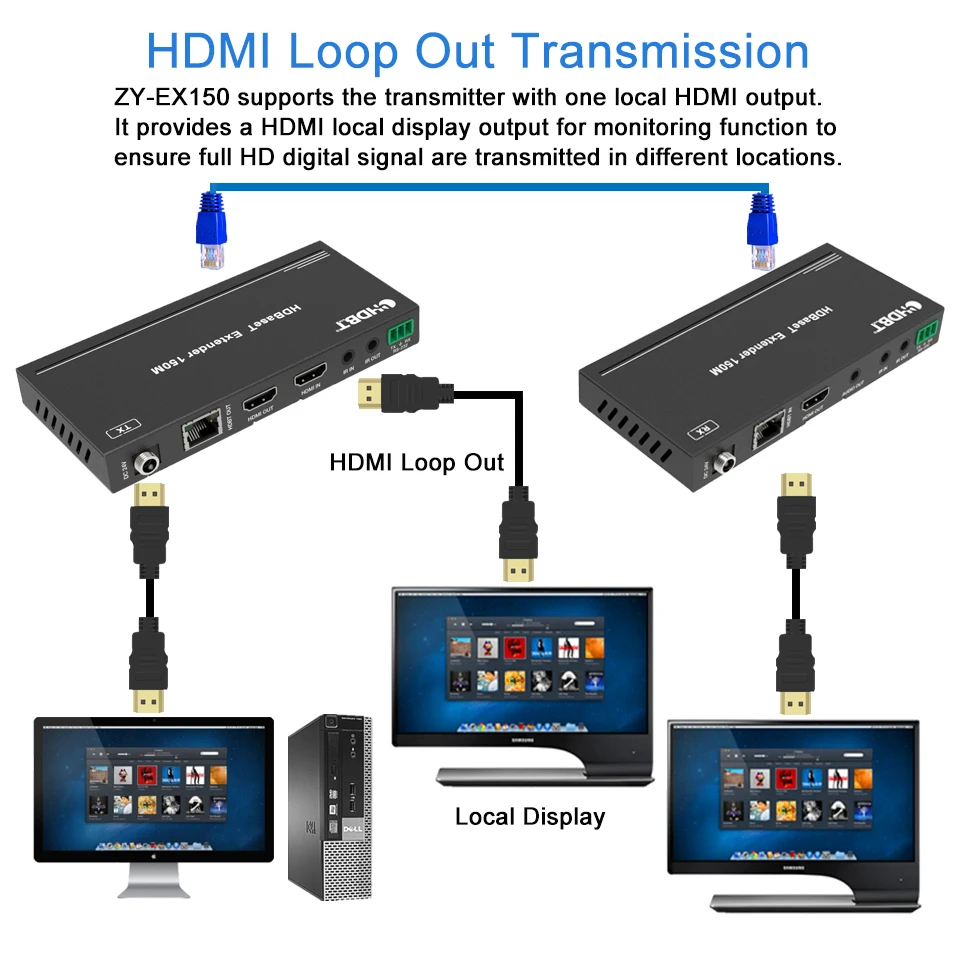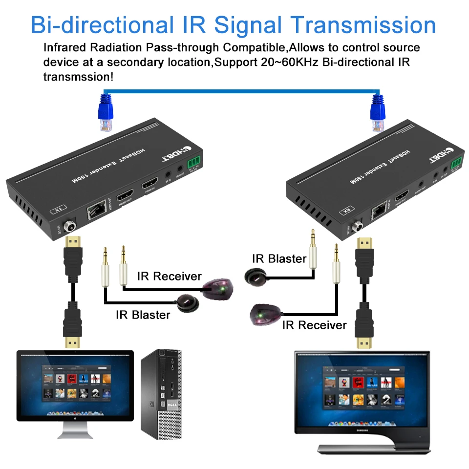 El extensor HDMI Navceker de 18Gbps puede extender la señal de video / audio de alta definición, por infrarrojos bidireccional, a la vez, a la 1 a la 2, a la 2, Y la distancia es de hasta 492 pies/150 metros entre transmisor y receptor a través de un solo cable CAT. Soporta una resolución de hasta 4K2K @ 60Hz 4:4:4, 18Gbps y HDCP 2,2. Un puerto de bucle HDMI está disponible para la salida. También admite audio integrado para salida de audio L/R y función PoC. Además, el extensor está equipado con paso IR bidireccional que permite el control de la fuente y la pantalla.