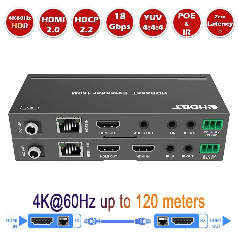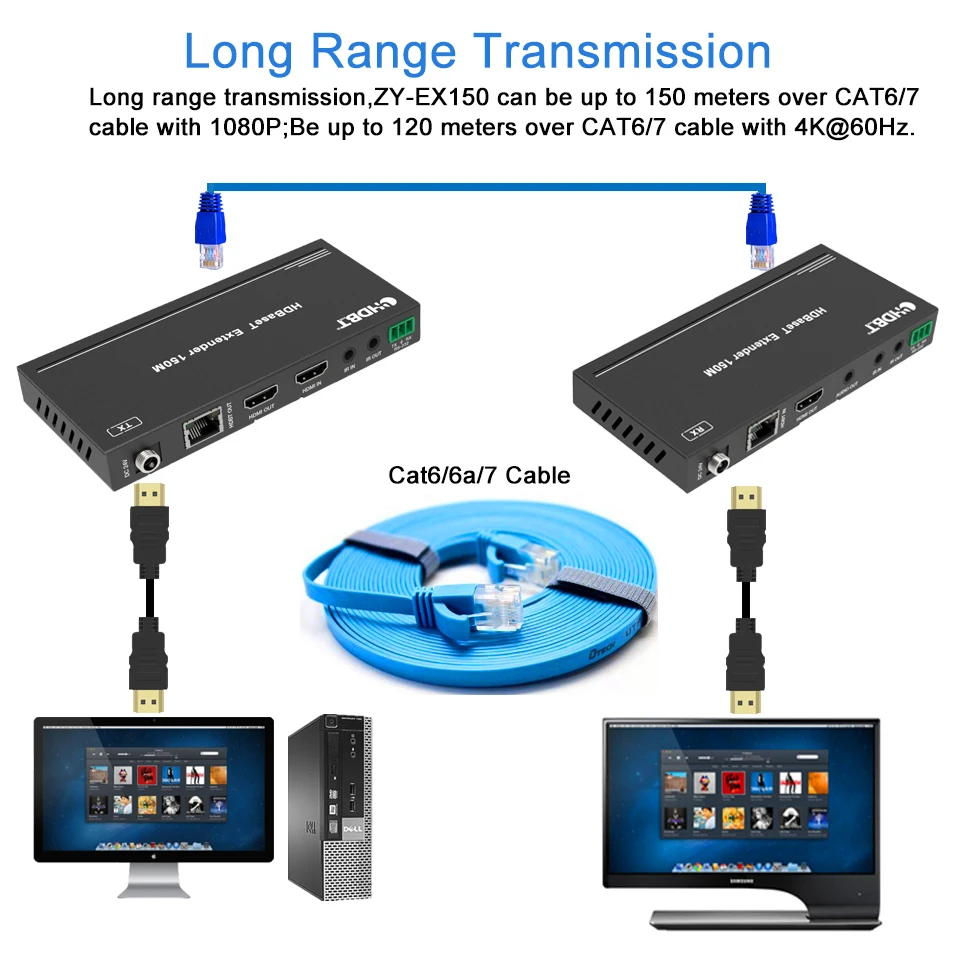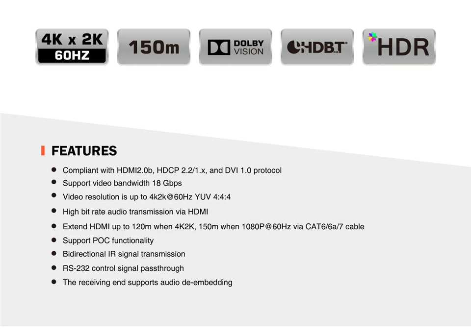 Transmite video HDMI y audio 4K @ 60Hz señal hasta 120m y señal 1080P hasta 150m a través de un solo cable CAT6/7;