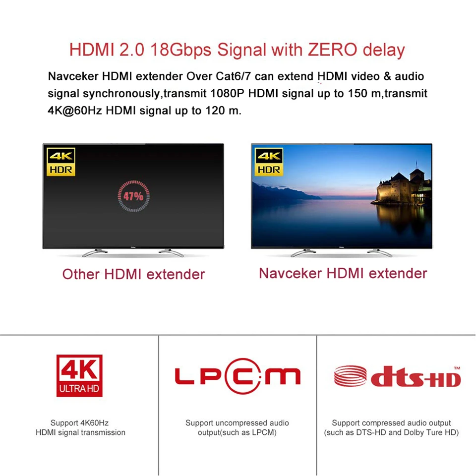Comprar Navceker-extensor HDMI RJ45, 4K, 60Hz, Cat6, 60M, 120M, Kit de Audio HDMI sobre Ethernet, Cat5e, para PS4, Apple, TV, ordenador portátil, HDTV