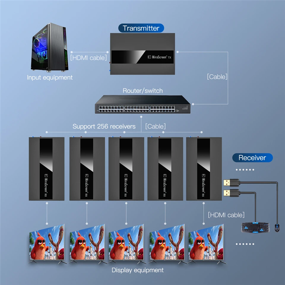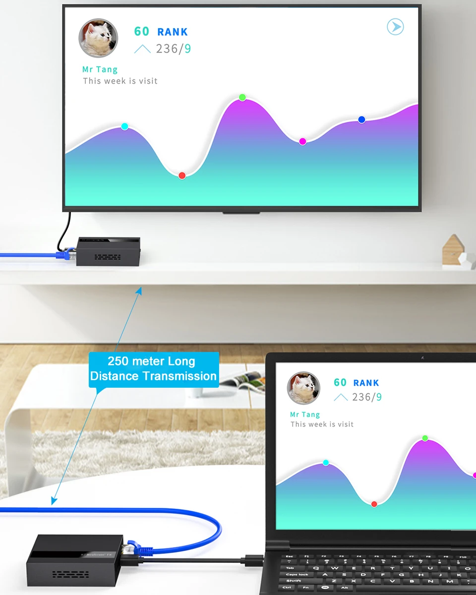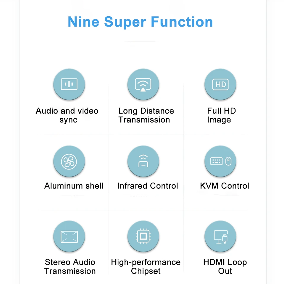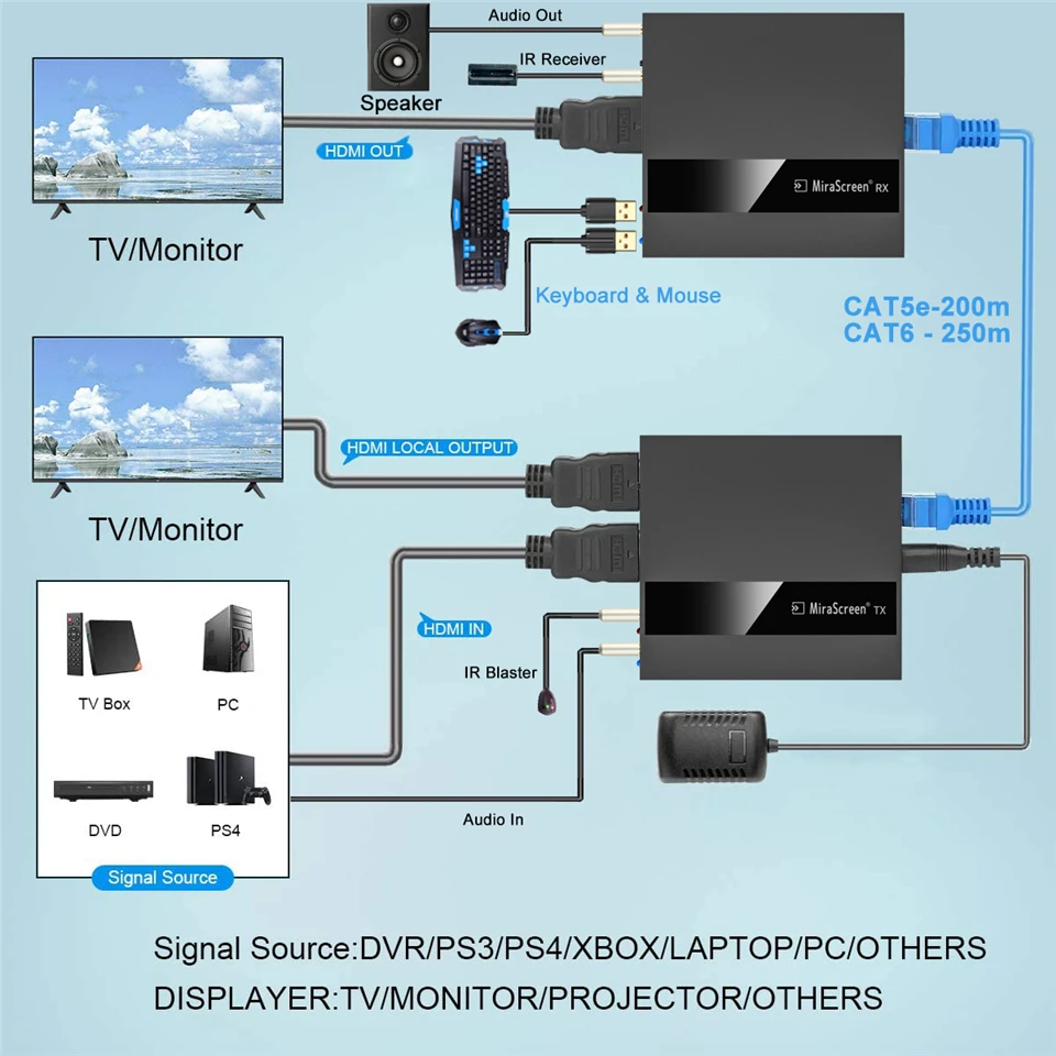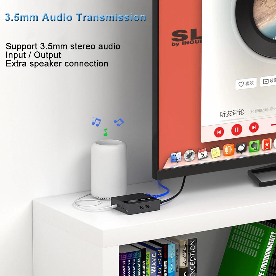 El extensor HDMI Navceker proporciona una extensión de señales HDMI de larga distancia a través de un solo cable CAT5e/6/7, admite una alta resolución de hasta 1920x1080 a 60Hz, señal infrarroja, señal de audio estéreo, señal de teclado y ratón y transmisión de bucle HDMI. El extensor se puede utilizar para una amplia gama de aplicaciones que requieren transmisión a larga distancia de alta resolución con alta calidad por su buena estabilidad y potente seguridad.