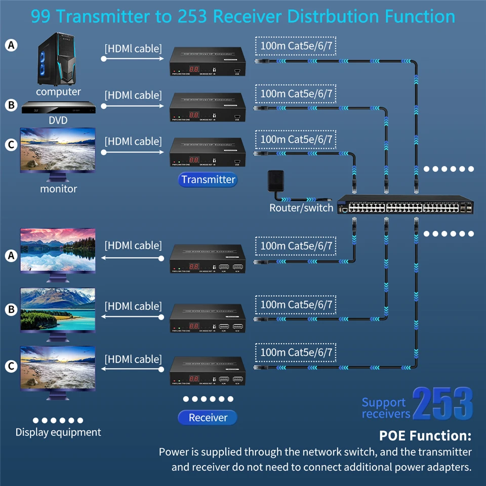 De Mujer a mujer:Aplicación TCP/IP,N TX (máximo: 99 TX) a N RX (máximo: TX 253) con conmutador Ethernet/conmutador POE/ENRUTADOR;