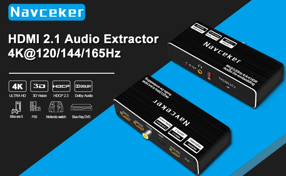 El Extractor de audio Navceker 4K 120Hz HDMI 2,1 es un extractor de audio de alto rendimiento con 1 entrada HDMI y 1 salida HDMI. Solo audio HDMI/Toslink/coaxial/salida de audio Jack de 3,5mm compatible con la función de extracción de audio, el sistema admite todos los formatos de TV 3D además de todos los formatos HDTV de hasta 8K @ 60Hz,3840x2160 @ 120Hz RGB 4 :4 :4.