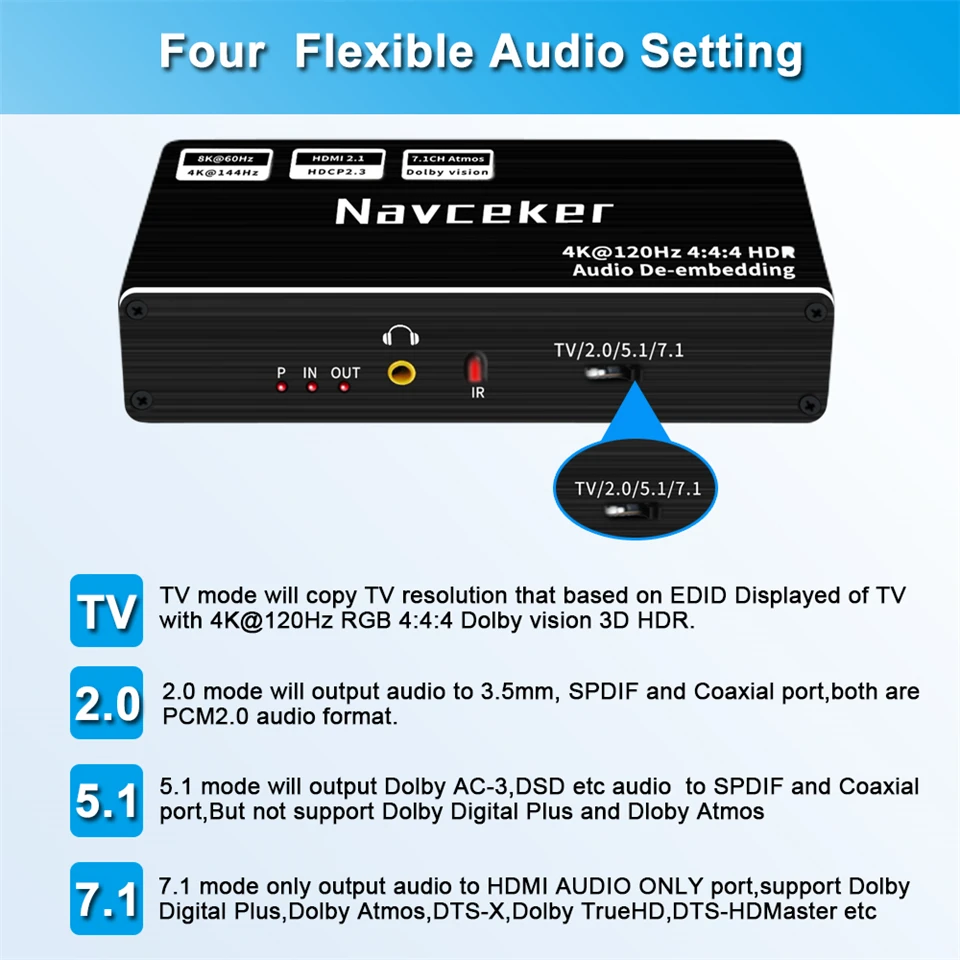 Comprar Navceker-Extractor De Audio 8K, 60Hz, HDMI, 4K, 120Hz, RGB, 4:4:4, HDMI 2,1, convertidor divisor De Audio 7,1, Dolby, Atmos, De-embed para PS5, XBox